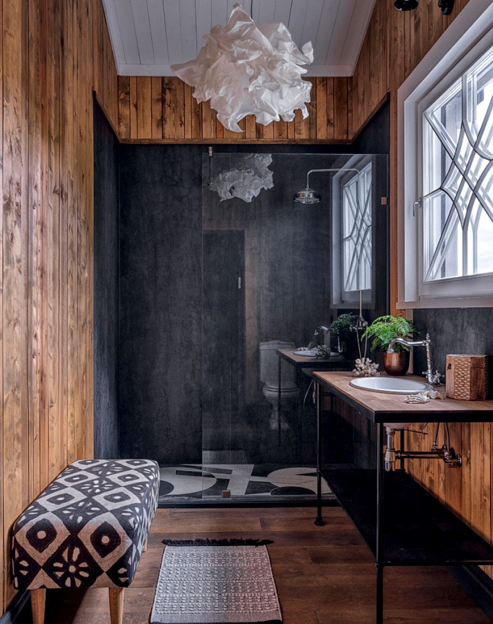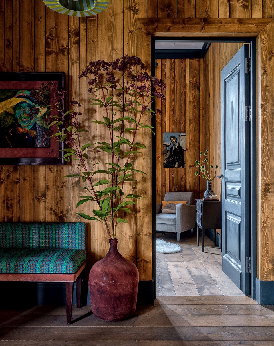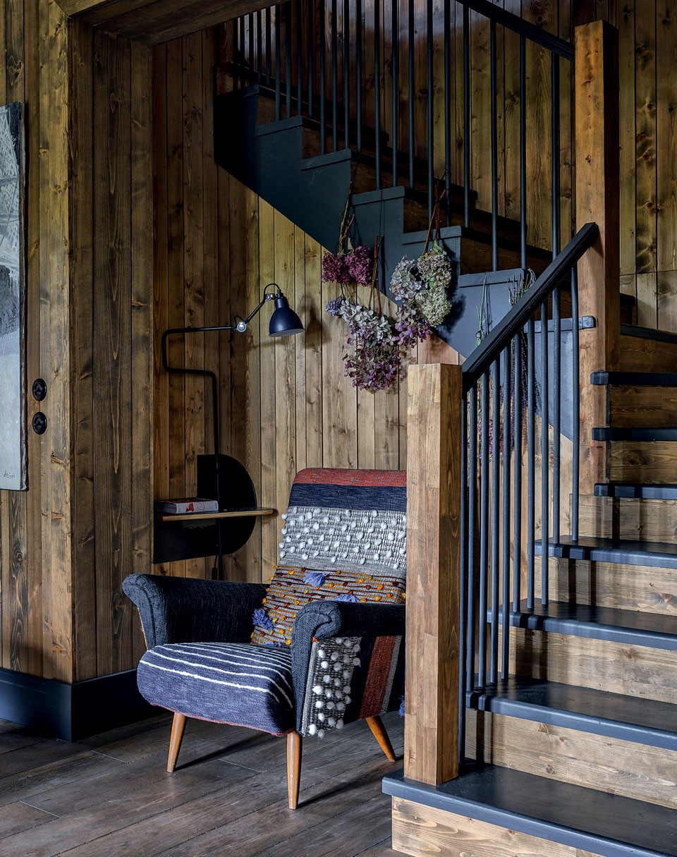 Построенный из бруса дом задавал определенный стиль, но декоратор захотела уйти от навязчивой рустики и обшила все стены вертикальными досками со сложным ритмом и тонировкой, которые долго подбирались. Фон получился довольно активным, поэтому для визуального баланса в интерьере появились не менее броские шторы с принтами по эскизам Йозефа Франка, знаменитого австрийского художника, наследие которого изучают в дизайнерских школах и демонстрируют в музеях всего мира. Мия нашла ткани по его эскизам в шоуруме шведской марки Svenskt Tenn в Стокгольме, который не менял свой адрес с 1924 года. “Мне нравятся сложные узоры и неожиданные коллаборации, — говорит декоратор. — К примеру, ковер в гостиной соткан на французской семейной мануфактуре Ateliers Pinton по эскизам начинающей дизайнерской студии Ma Poésie”. Дополняют обстановку английский винтажный диван и необычное кресло с пуфом современной итальянской марки Imperfetto Lab.