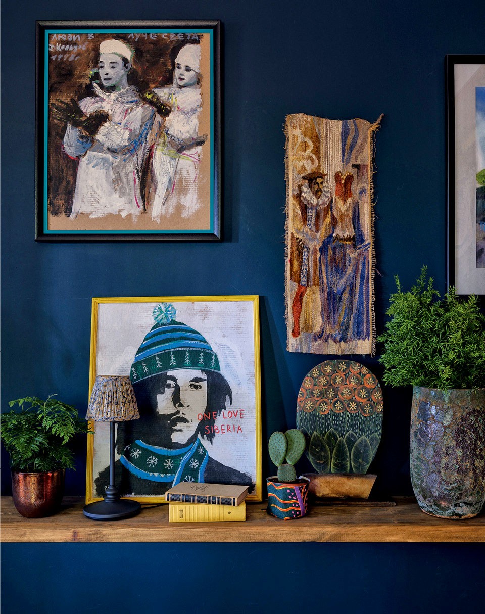 Стоит отметить, что Мия Карлова выросла в семье галериста и искусствоведа и с детства была окружена живописью и арт-объектами. Именно поэтому перед нами не аскетичный и типовой советский интерьер, а яркий и артистичный. За это отвечают не только картины, но и керамика, гобелены и другие декоративные детали, делающие интерьер живым. Многие предметы покупались практически “с колес”. К примеру, на упомянутый выше ковер для гостиной декоратор наткнулась в инстаграме (соцсеть признана в РФ экстремистской и запрещена) еще до того, как его выпустили в продажу, и поняла, что это именно то, что ей нужно. А журнальный столик со столешницей из синего стекла, который можно увидеть в комнате с камином, сделан на заказ по ее эскизам. “Этот интерьер не история, воссозданная в деталях, а мои впечатления о детстве на даче, переосмысленные воспоминания, некое послевкусие”, — объясняет Карлова.