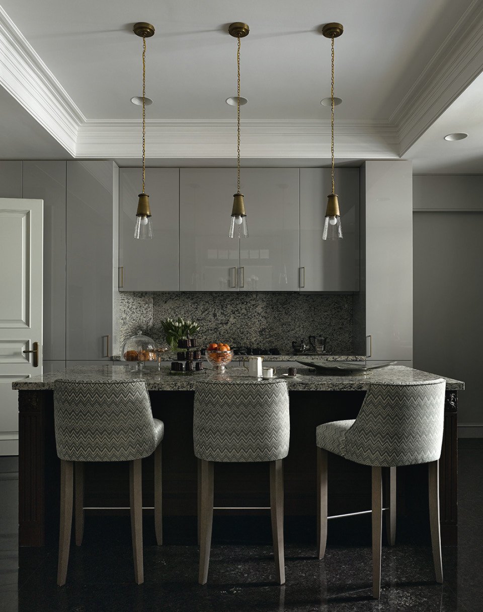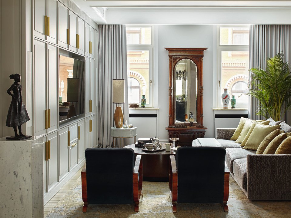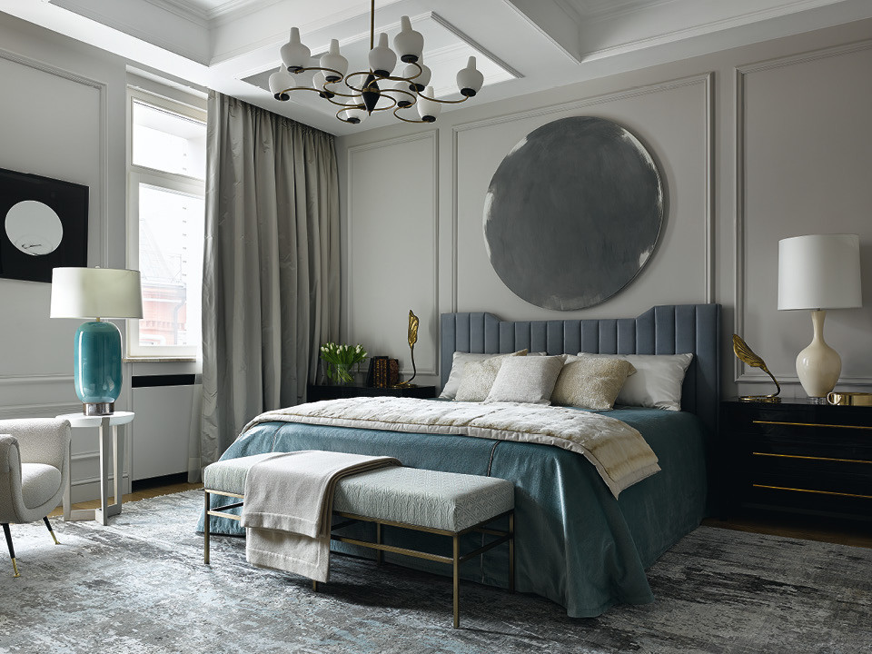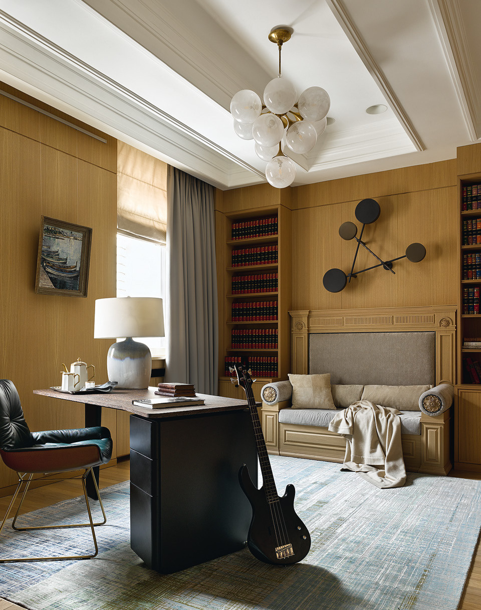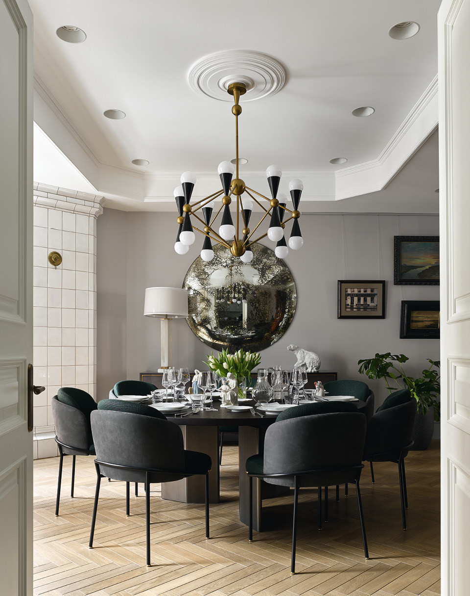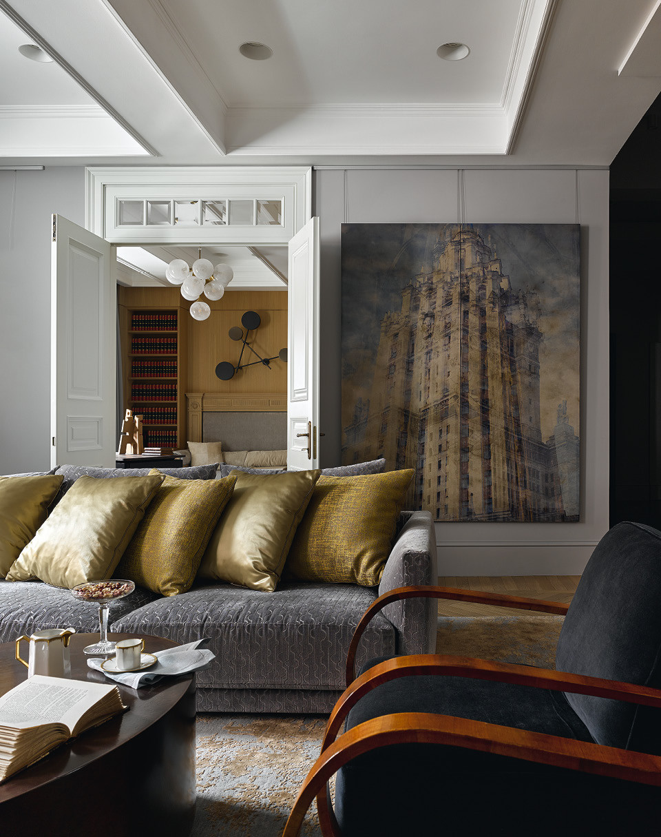 Хозяйка квартиры очень любит антиквариат, с удовольствием ездит на выставки и выбирает интересные предметы, а вот муж заказчицы — сторонник современных интерьеров, поэтому его основной просьбой было “дозировать” количество винтажа и антиквариата. “Большая часть мебели, которую мы подобрали для этой квартиры, безусловно, новая, но некоторые предметы, например трюмо в гостиной и буфет в столовой, старинные, — вспоминает Ольга. — Вместе с заказчицей мы полетели на антикварную ярмарку в Парме, хотели подобрать буфет, но подходящего не нашли, вместо него купили два австрийских кресла 1940‑х годов, которые отлично подошли для гостиной, их даже не пришлось реставрировать”. А буфет нашли на “Авито”, он сделан русскими мастерами, что нынче редкость, а его капители украшают барельефы в виде бородатых домовых. Одну из стен в гостиной занимает масштабная работа “Высотка” Владимира Клавихо-Телепнева, в которую заказчики сразу влюбились, и так получилось, что выбранная дизайнерами цветовая гамма идеально подошла под цвета на этом снимке.