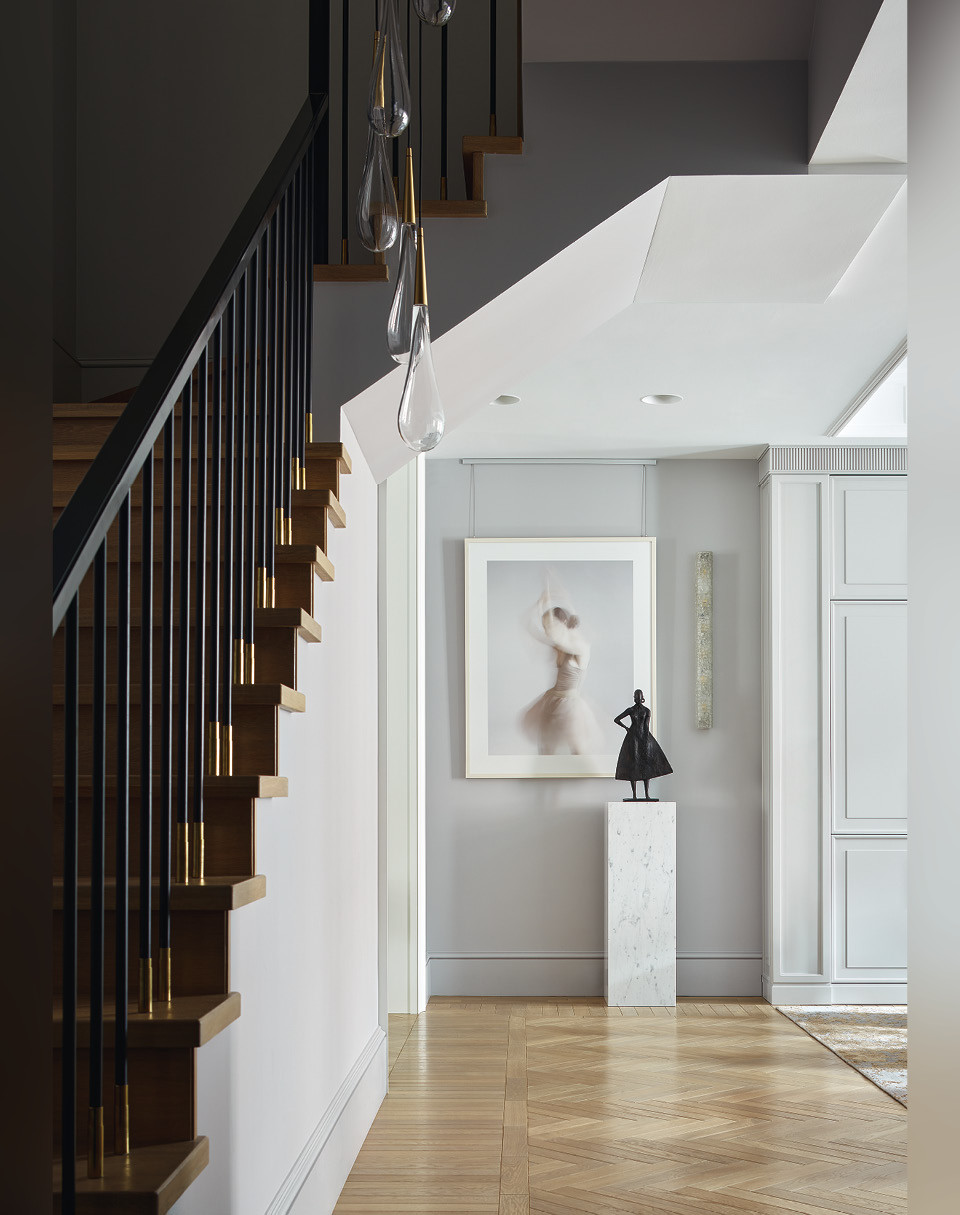 Хозяйка этой квартиры очень давно дружит с дизайнером Ольгой Володиной, поэтому, купив двухэтажную квартиру в районе Патриарших прудов, сразу обратилась за помощью к подруге. Работы предстояло очень много, ведь последний раз квартиру ремонтировали в начале 1990‑х годов, и там царила типичная для тех времен обстановка — натяжные потолки и множество перегородок из гипсокартона, которые, конечно, пошли под снос. “Мы с архитектором Анной Цветковой решительно убрали все стены, кроме несущих, и разделили пространство на общественную и личную зоны, — рассказывает Ольга Володина. — На первом этаже расположили холл, гостиную, кухню, столовую и кабинет, а второй отдали под спальню и детские комнаты”.