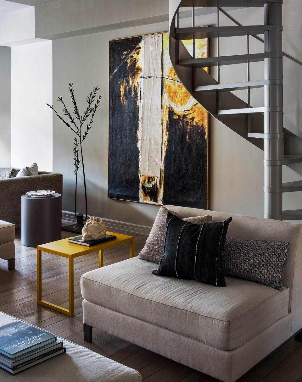 Фрагмент гостиной. Лестница ведет на чердак и террасу. Столики по дизайну Андреа Трульё.