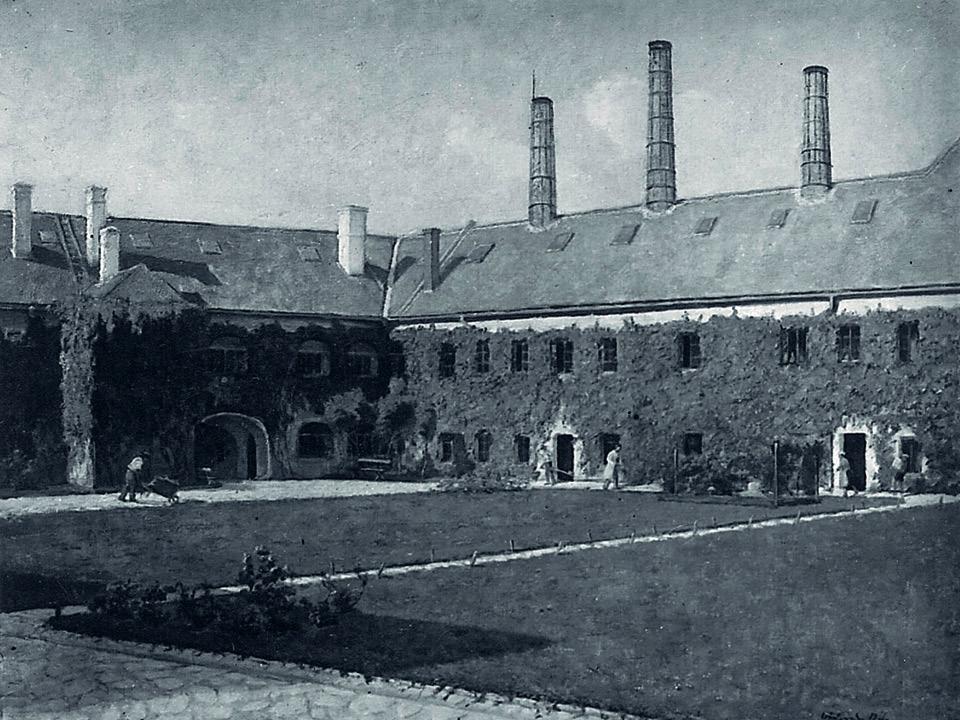 Историческая и современная фотографии внутреннего двора мануфактуры.