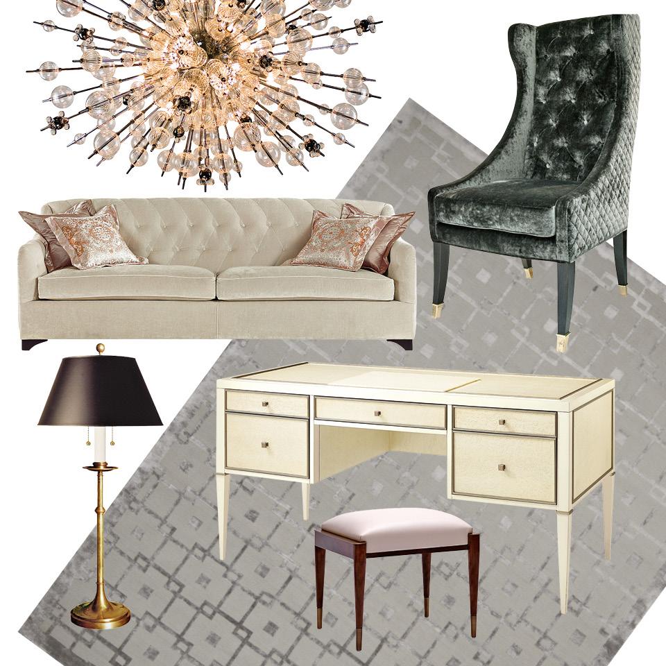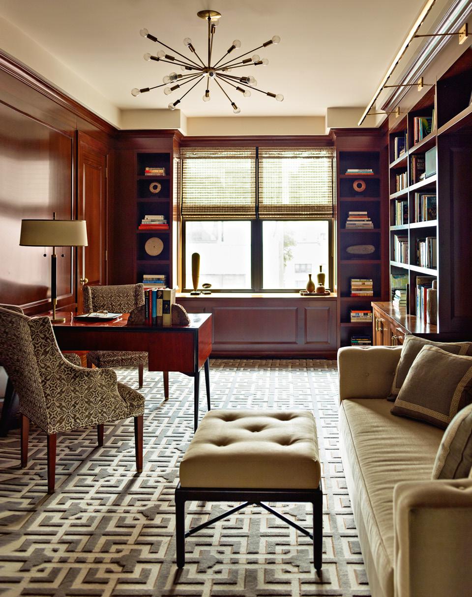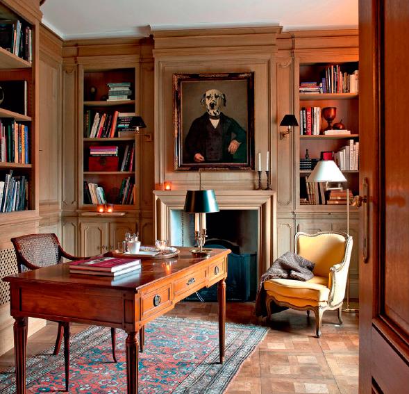 В этом кабинете элегантность поддерживается каждой деталью: будь то изящные ножки кресел и стола или симметрия на полках. Настроиться на работу в таком организованном пространстве проще простого.