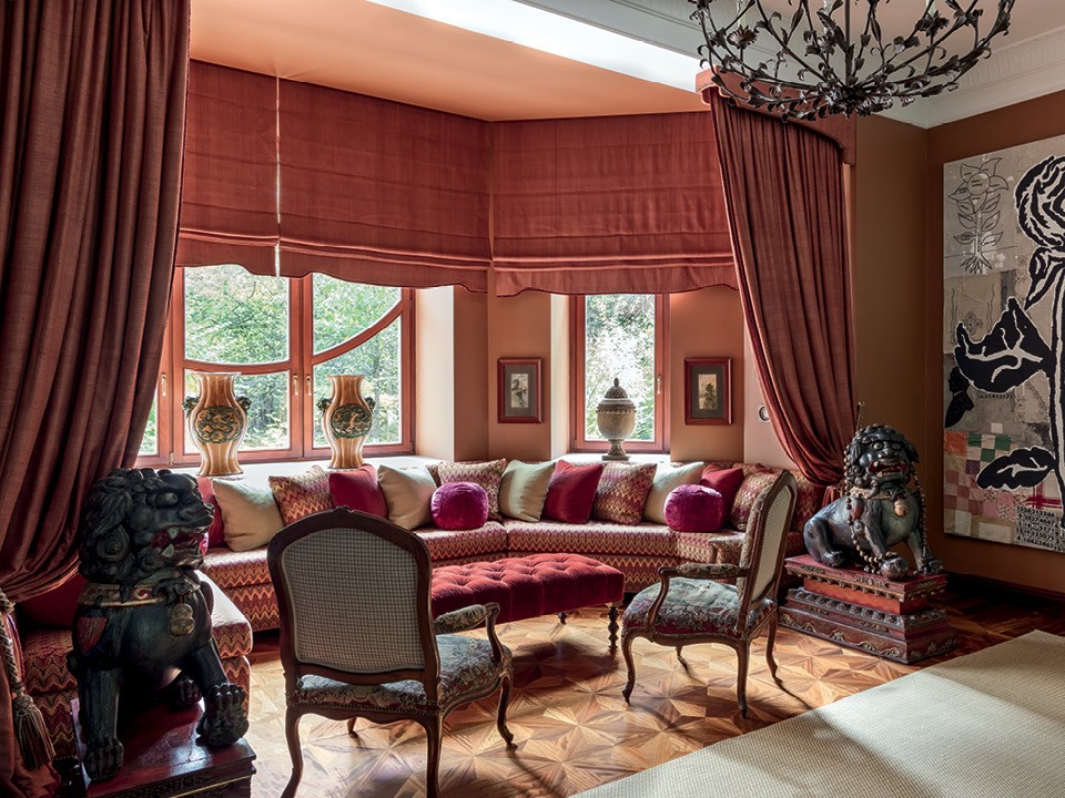 Быстро поесть можно прямо на кухне, а для серьезных приемов пищи лучше пройти в столовую. Это единственное помещение во всем доме, которое Кирилл решил не “облегчать”, а сделать по-настоящему роскошным. Дизайнер оставил существующий художественный паркет с фантазийным фризом из разных пород дерева, а в дополнение к нему отделал фактурными обоями нижнюю часть стен и потолок. Ткань для штор купила хозяйка дома, а Кирилл придумал ламбрекены с вышивкой в стиле модерн, которые поддерживают узоры оконных рам.