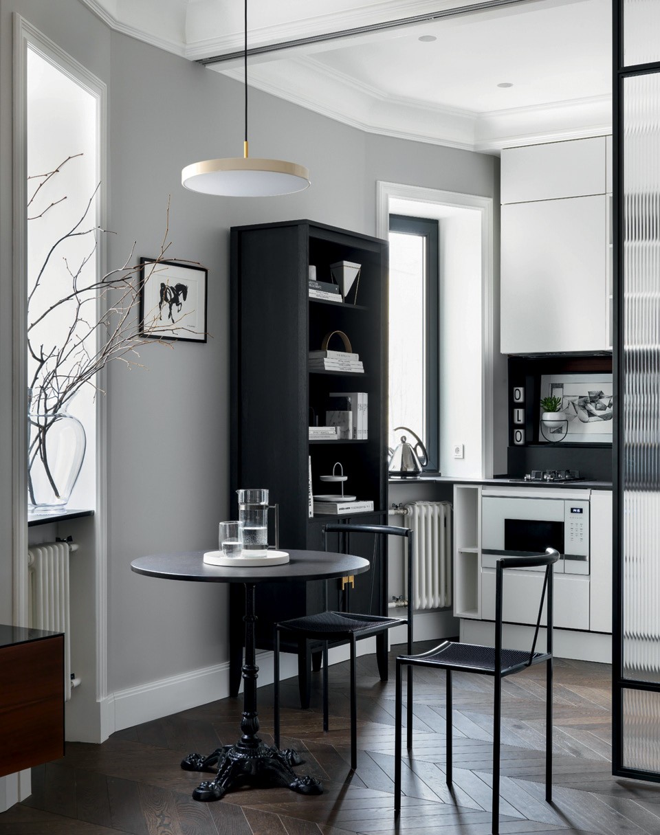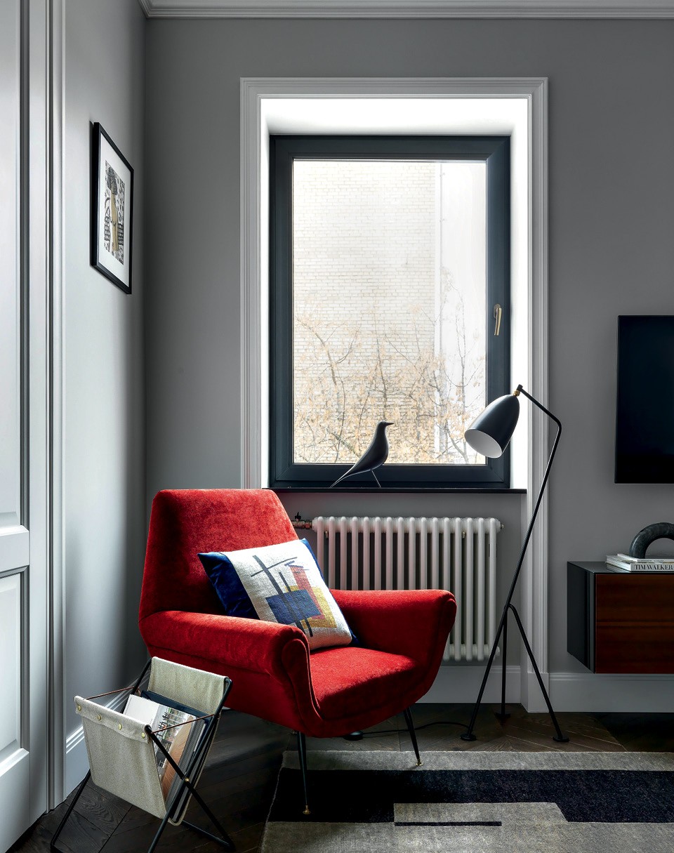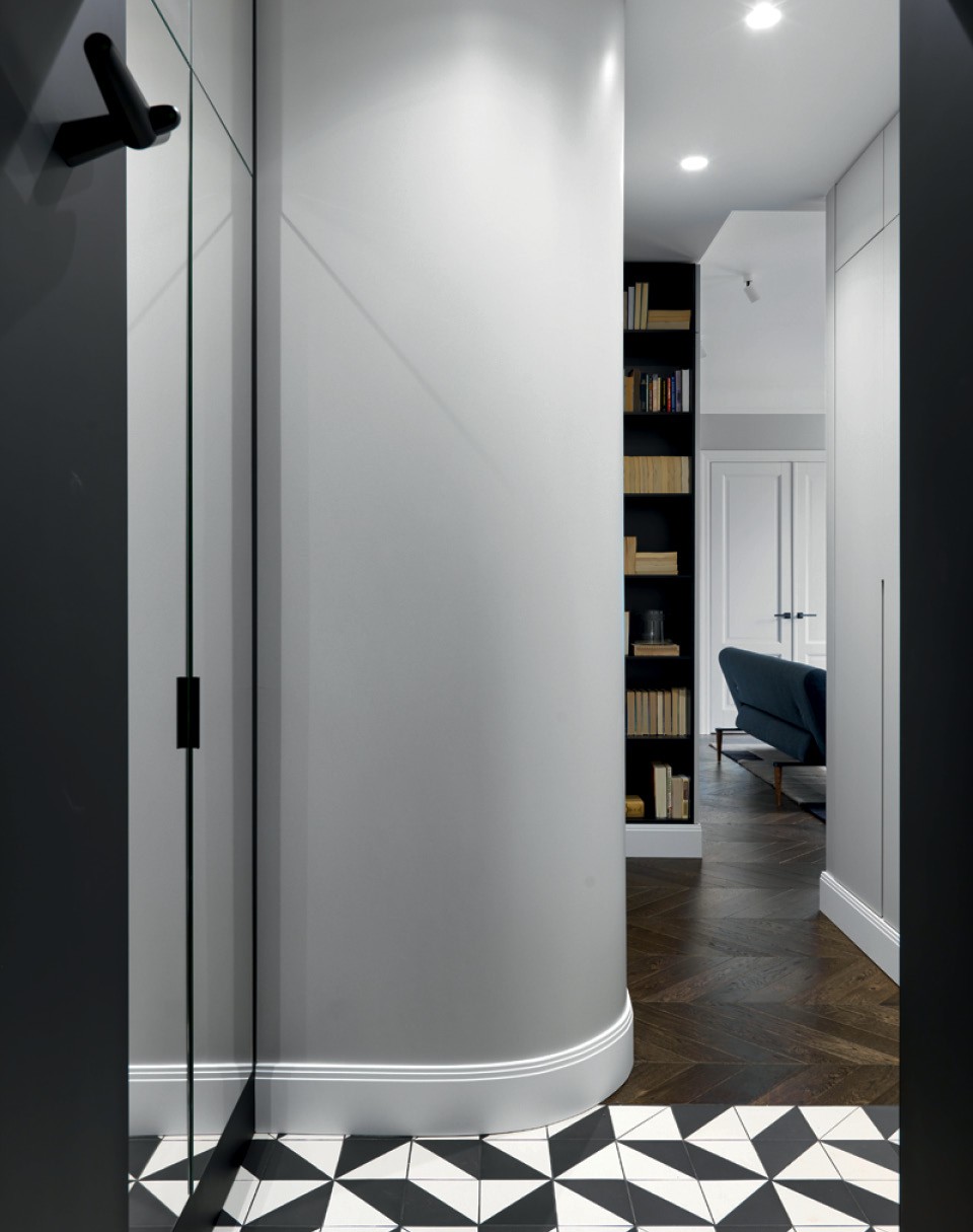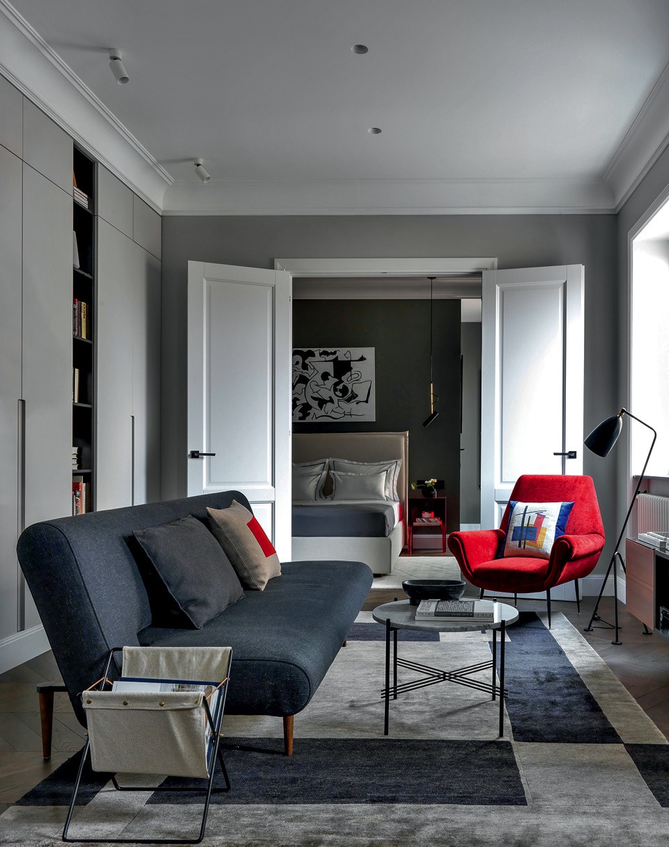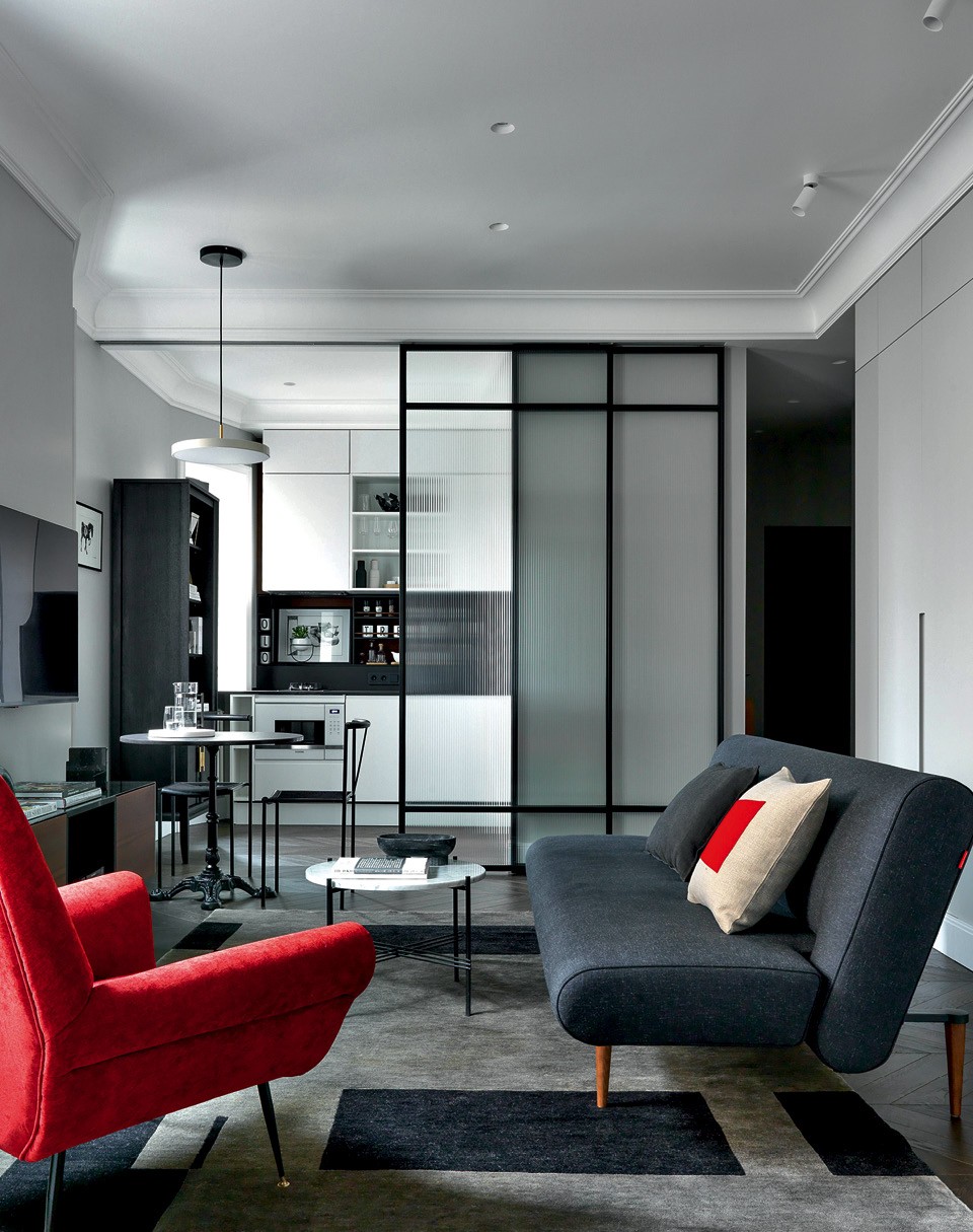 Квартира предназначена для молодой пары, они хотели, чтобы в их жилище были большая общественная зона и скрытая от посторонних глаз приватная, а также достаточное количество мест хранения. Вокруг дома множество кафе и ресторанов, поэтому полноценная кухня не требовалась, и дизайнеры выделили под нее небольшой угол, который при необходимости можно закрыть тонкой стеклянной перегородкой. Кухня и гостиная светлые, как и хотели заказчики. На эту зону приходится три окна, но они узкие и света дают не так много, как хотелось бы, поэтому дизайнеры решили не закрывать окна шторами, зато отделали оконные проемы наличниками, что сразу придало помещению парадный вид. Одну из стен отдали под большой шкаф, в нем три отделения для одежды, которые перемежаются открытыми стеллажами для книг. А чтобы фасады шкафа не слишком выделялись, их покрасили ровно в тот же цвет, что и стены.