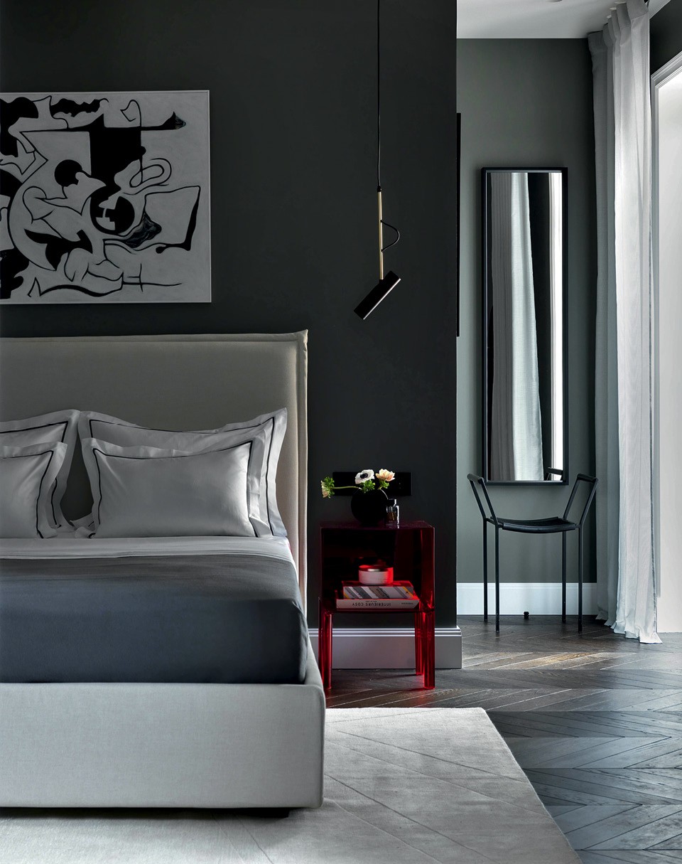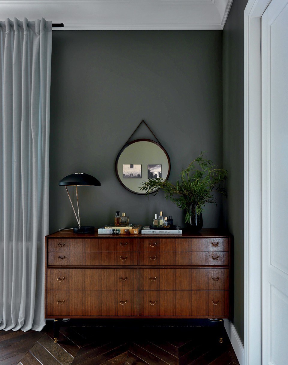 Спальню же хозяева, напротив, попросили насыщенную, темную. Контрастно белую кровать с местом для хранения под матрасом сделали на заказ, а прикроватные тумбы Kartell заказчики купили сами. За кроватью в спальне прячется гардеробная, которую планировали очень тщательно. Вера Жигалева рассказывает: “Наши заказчики — люди системные и требовательные к порядку, они сразу сказали, сколько рубашек, костюмов и пар обуви нужно будет разместить в этой гардеробной”.