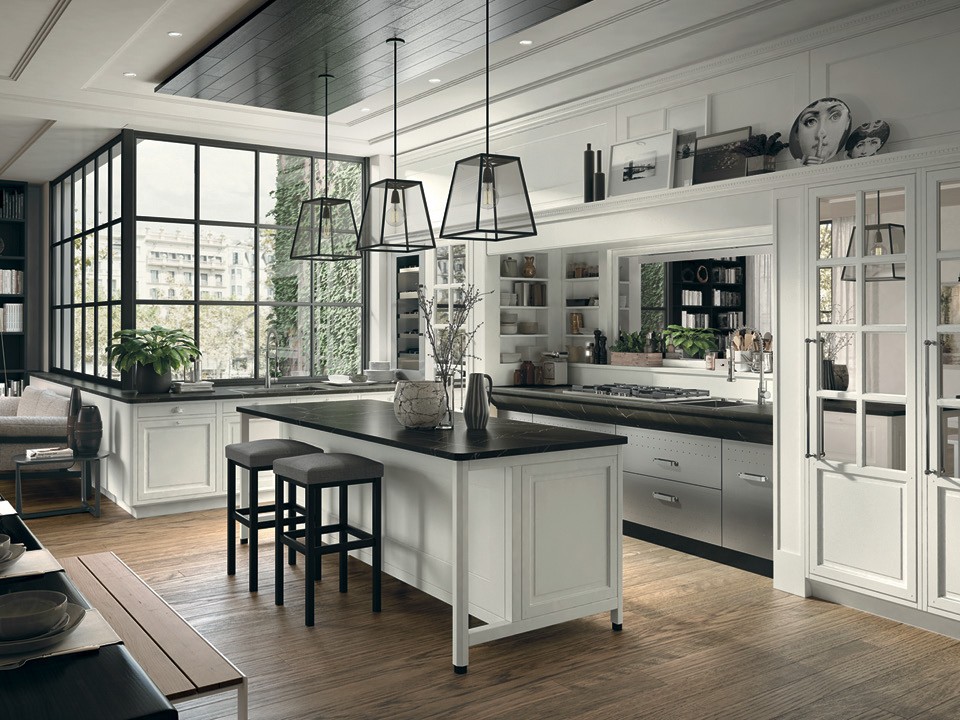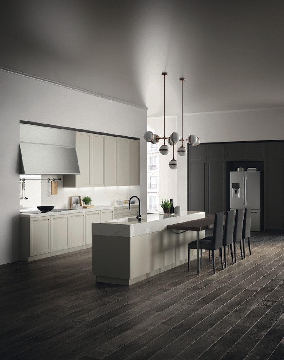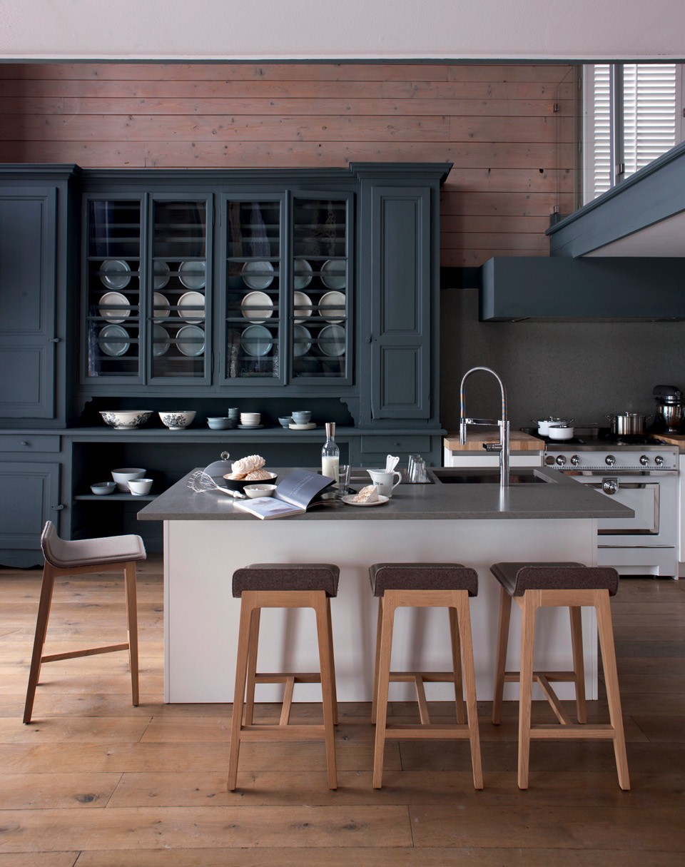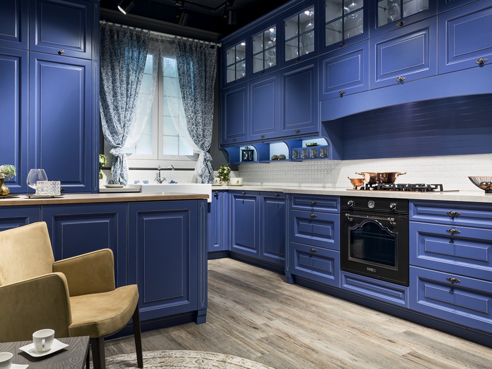 Современная классика — беспроигрышный вариант для создания уютной обстановки. Не бойтесь темных цветов: фасады с филенками смягчат даже самый драматичный оттенок. В таких кухнях уместна будет не только современная бытовая техника, но и винтажного вида модели с заметной металлической фурнитурой.