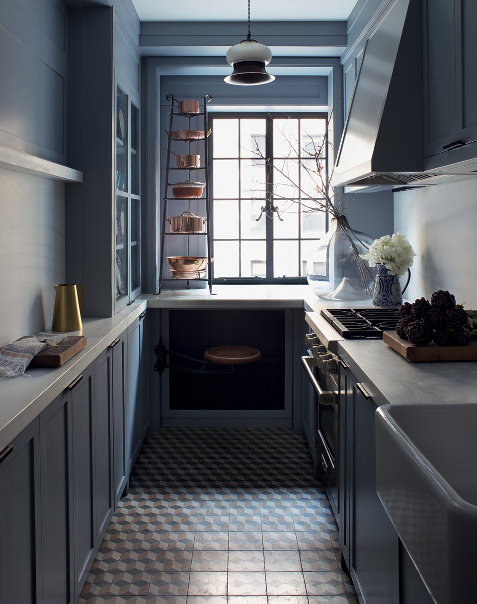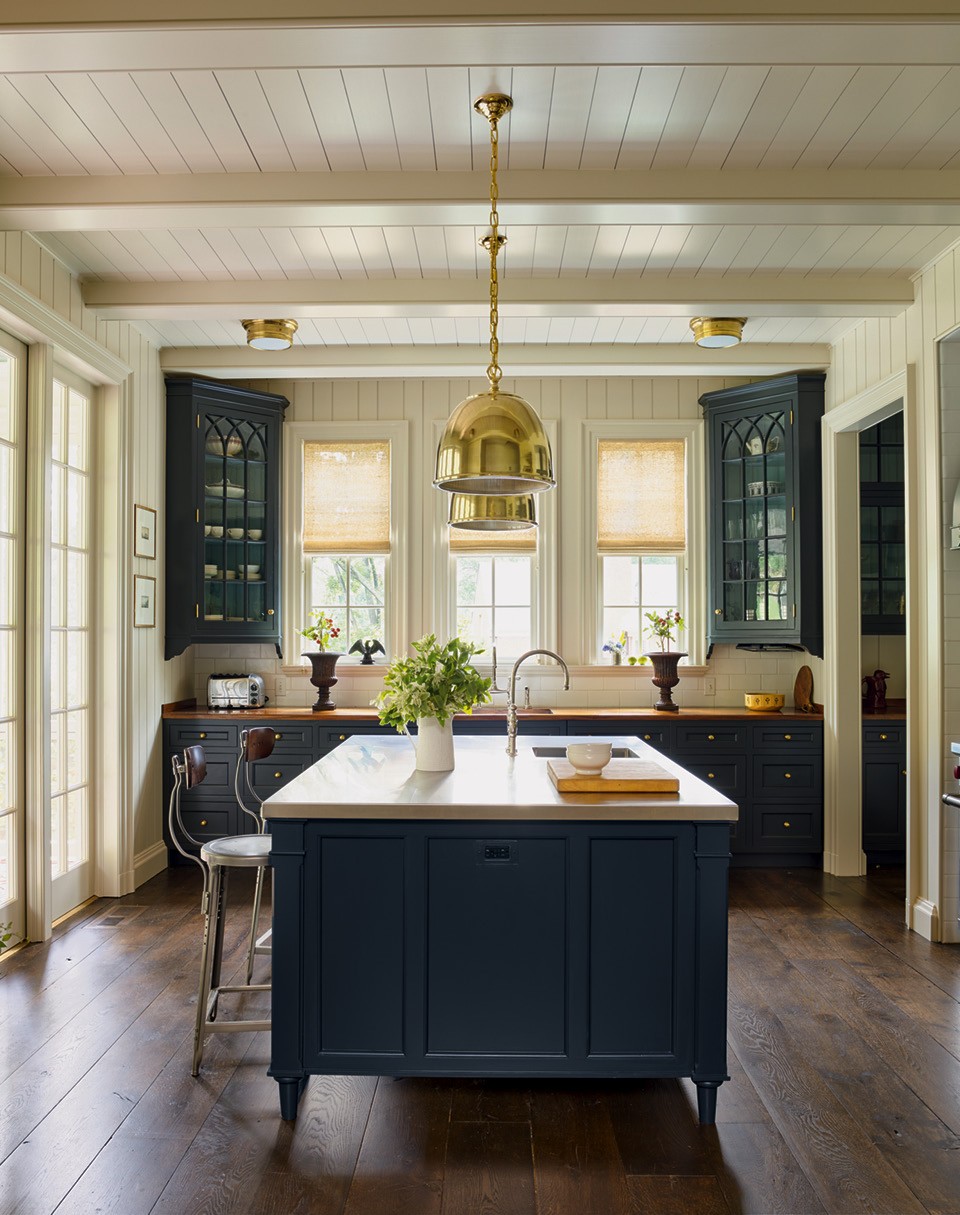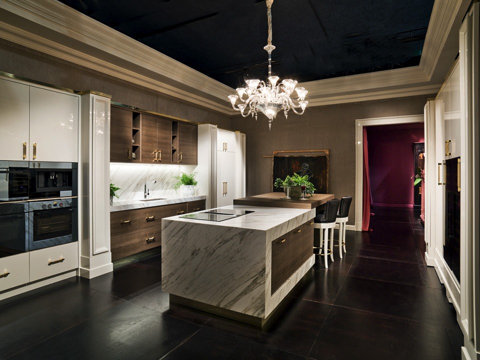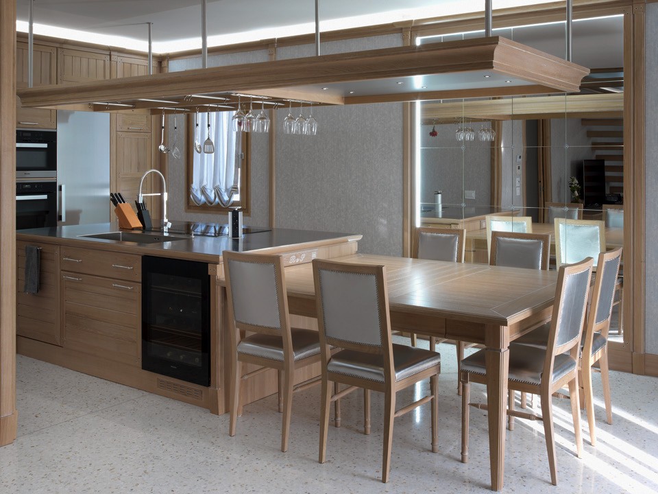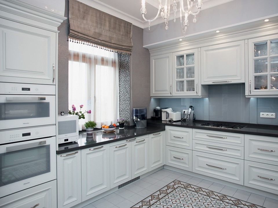 Современная классика — беспроигрышный вариант для создания уютной обстановки. Не бойтесь темных цветов: фасады с филенками смягчат даже самый драматичный оттенок. В таких кухнях уместна будет не только современная бытовая техника, но и винтажного вида модели с заметной металлической фурнитурой.