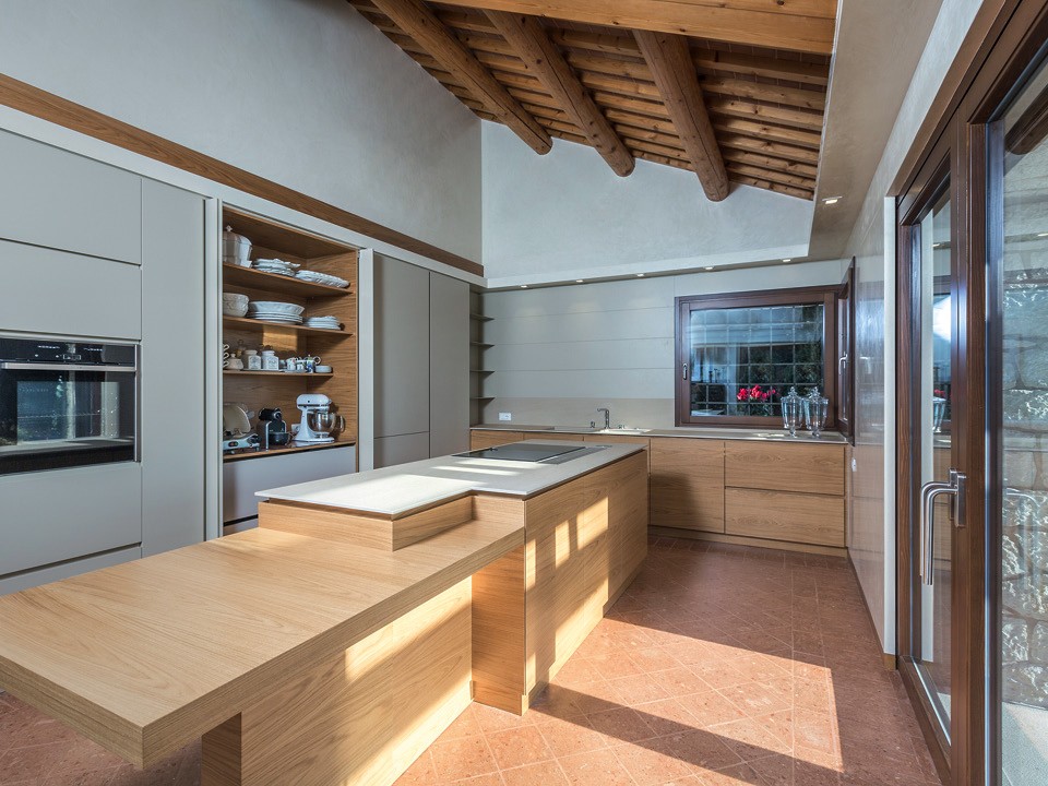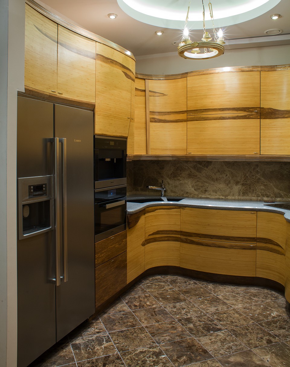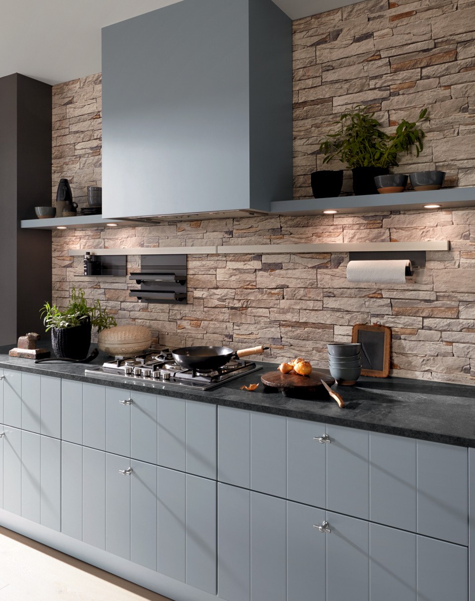 Камень — один из самых распространенных материалов для рабочей поверхности на кухне. Он хорошо сочетается с любой отделкой, в том числе и с деревом. Оба эти материала очень практичны: современные варианты финишных покрытий делают дерево износостойким, ударопрочным и почти вечным. Камень часто прочен сам по себе, к тому же он красиво стареет.