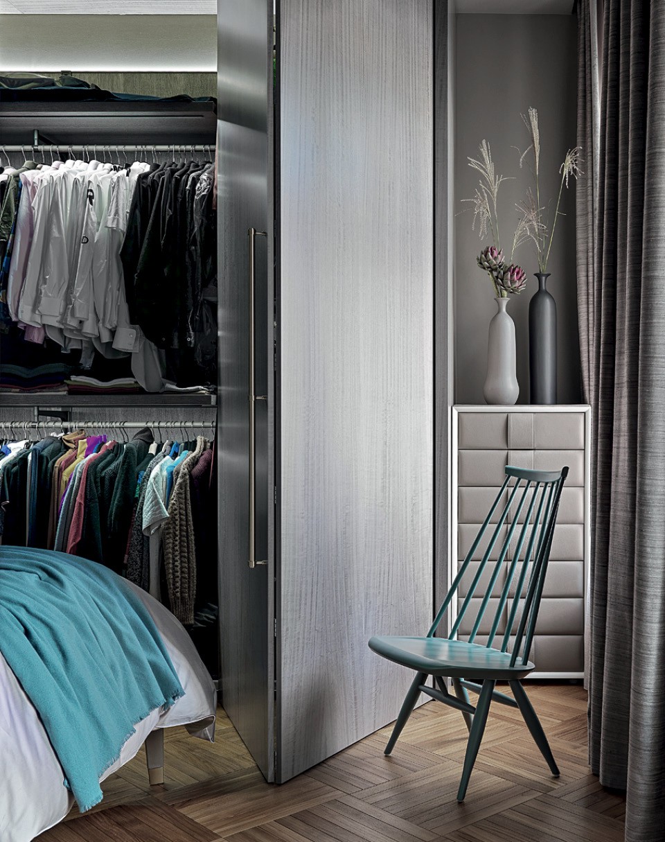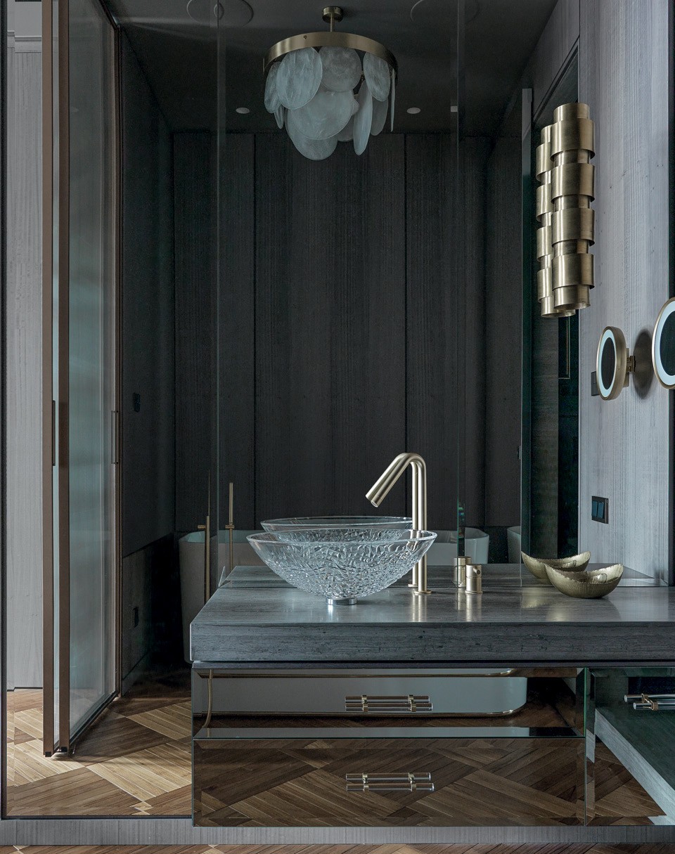 Эта квартира не единственная у хозяйки, поэтому шкафы для одежды тут относительно небольшие: тот, что в спальне, сделан на заказ — так, чтобы можно было полностью открыть его двери-гармошки и увидеть все содержимое сразу. Зато ванная занимает едва ли не четверть площади и оформлена очень нарядно — с зеркальными шкафчиками и латунными деталями. Для квартиры, которая сделана не на показ, а для удовольствия хозяйки, это логичное решение.