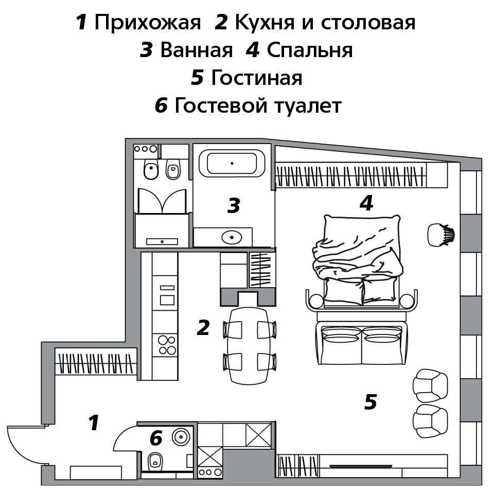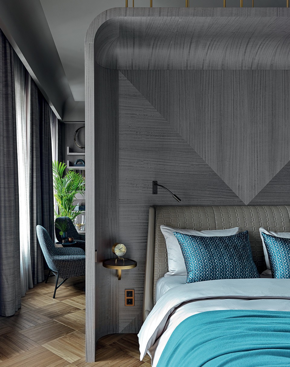 Хозяйка купила квартиру с ремонтом в классическом стиле, пожила в ней несколько месяцев, потом пыталась изменить интерьер своими силами и, наконец, решила довериться Ольге, c которой ее свели общие знакомые. Прежняя планировка была неудачной: слишком много стен и коридоров, поэтому Ольга все полностью перекроила, сделав квартиру максимально открытой. В частности, отказалась от стены между спальней и гостиной, заменив ее перегородкой-коконом, “обнимающим” кровать. Ольга говорит, что не хотела доводить эту конструкцию до потолка, “чтобы сохранить воздух”. Со стороны кухни-столовой спальное место спрятано за деревянным блоком, который дизайнер выстроила вокруг единственной несущей колонны (в ней есть декоративная ниша, а также места для хранения).
