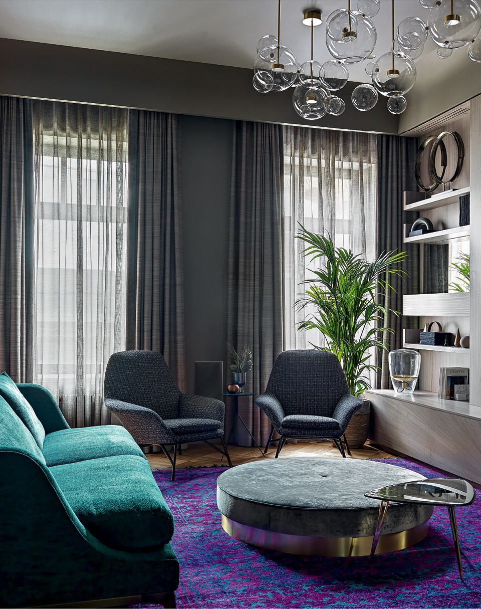 В отделке интерьера преобладают спокойные серые оттенки, а вот обивка мебели, наоборот, яркая. Как рассказывает Ольга, все началось с ковра: хозяйка его очень любит и возит с собой с квартиры на квартиру. В тон ему подбирались и диван, и кресла (если присмотреться, в их обивке есть вкрапления тех же цветов, что и на ковре). Картина над диваном нарисована на заказ — опять же чтобы добавить в интерьер ярких красок, которые так нравятся заказчице.
