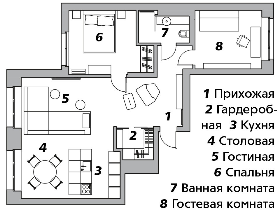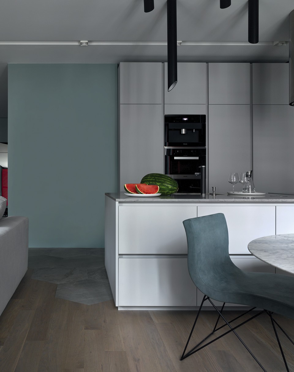 Пространства для жизни двух человек в этой калининградской квартире вполне достаточно, но хозяева решили не загромождать все шкафами или стеллажами, чтобы сохранить ощущение простора. Им вообще важнее была эстетическая составляющая, чем практическая: они хотели получать визуальное удовольствие, находясь дома. Марина сделала ставку на цвет и фактуру стен, которые и придали интерьеру более декоративный вид. Так, рельефная перегородка за телевизором сделана из гипсокартона, то же и в других комнатах: молдинги на стенах в спальне и гостевой комнате — это не лепнина, а менее дорогой гипсокартон. А вот в зоне кухни дизайнер использовала декоративное панно с узором. “Гладкие и глянцевые поверхности практичны, но выглядят холодно и слишком просто, а нам хотелось создать ощущение уюта. У нас был бюджет, в который надо было вписаться, но мы все равно постарались сделать интерьер эффектным”, — объясняет она.