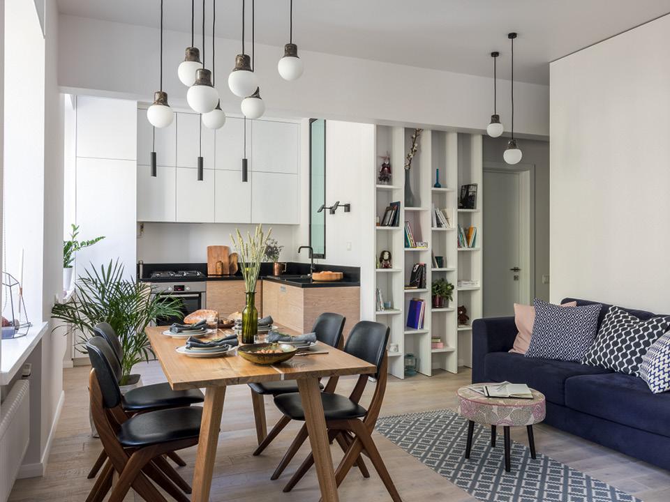 Молодые люди, обратившиеся в бюро “Точка дизайна”, мечтали о светлой квартире с яркими деталями и в перспективе собираются украсить свое жилище произведениями искусства. А еще у них недавно родился ребенок, так что дизайнер Екатерина Олейникова во всех смыслах проектировала интерьер на вырост. Она изменила планировку сталинской квартиры, объединив и расширив санузел, а также снесла перегородку между кухней и жилой зоной. За основу был взят лаконичный скандинавский стиль с добавлением винтажной мебели. Цветовая палитра построена на светлых акварельных тонах с акцентами в виде любимого хозяйкой “морского” синего цвета.