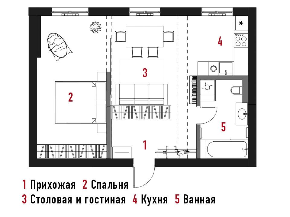 Зона гостиной в квартире сведена к дивану с синей обивкой. Стена, на фоне которой он установлен, на самом деле является задней стенкой встроенного шкафа, разделившего прихожую и жилую зону. Телевизора здесь нет, а основное место