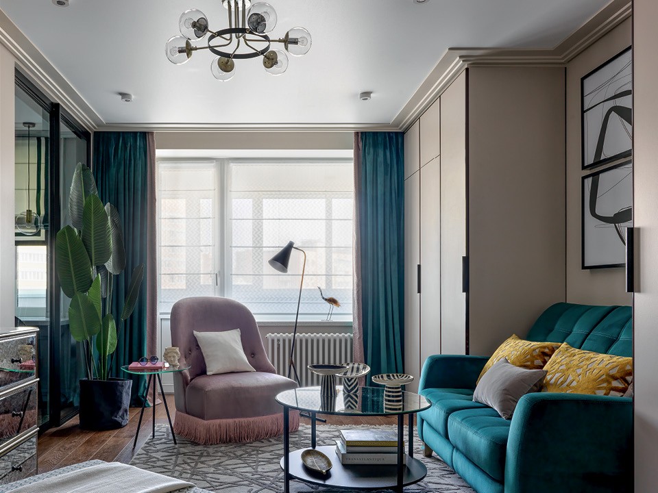 Первое, что сделала Марина, — разделила квартиру на четкие зоны: выделила кухню, прихожую, место для сна, общественную зону, вынесла стиральную машинку и хозяйственный шкаф на утепленную лоджию и полностью переоборудовала ванную комнату. От старой обстановки остались кровать и диван. Последний стал отправной точкой в цветовой гамме: в компанию к изумрудному дивану подобрали кресло