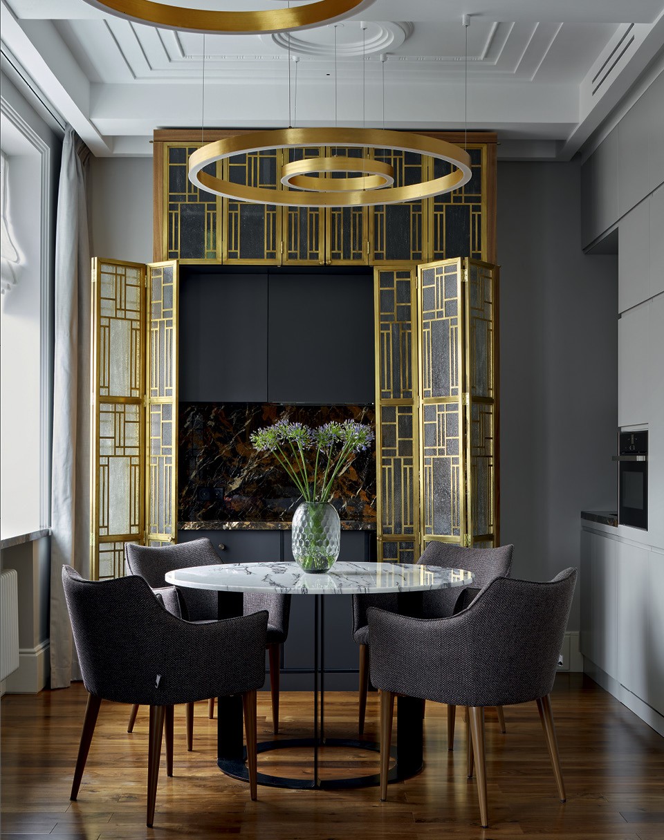 Главная роль в этой московской квартире отведена шкафам. Они являются местами для хранения, стенами и декоративными элементами. Перед архитекторами Павлом Железновым и Татьяной Борисовой стояла непростая задача — создать эффектный интерьер и разместить на небольшой площади все, что умещалось в трехкомнатной квартире, где заказчик жил до этого. “Я приезжал к нему в гости с рулеткой и измерял габариты шкафов”, — вспоминает Павел. В итоге большой гардероб отделяет спальню от прихожей. Кстати, здесь есть секрет: за одной из панелей скрыта дверь, сокращающая путь из спальни в ванную. Два шкафа в зоне столовой и гостиной заслуживают особого внимания. Они сделаны по эскизам архитекторов, латунные переплеты на фасадах одного из них повторяют узор решеток здания Центрального телеграфа в Москве, а другого — декоративный элемент с высотки NBC в Чикаго (такая ассоциация не случайна: хозяин учился в США). За декоративными дверцами в первом случае скрывается гардероб, во втором — рабочая