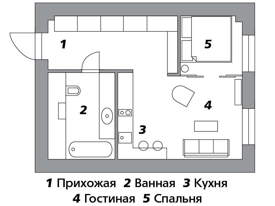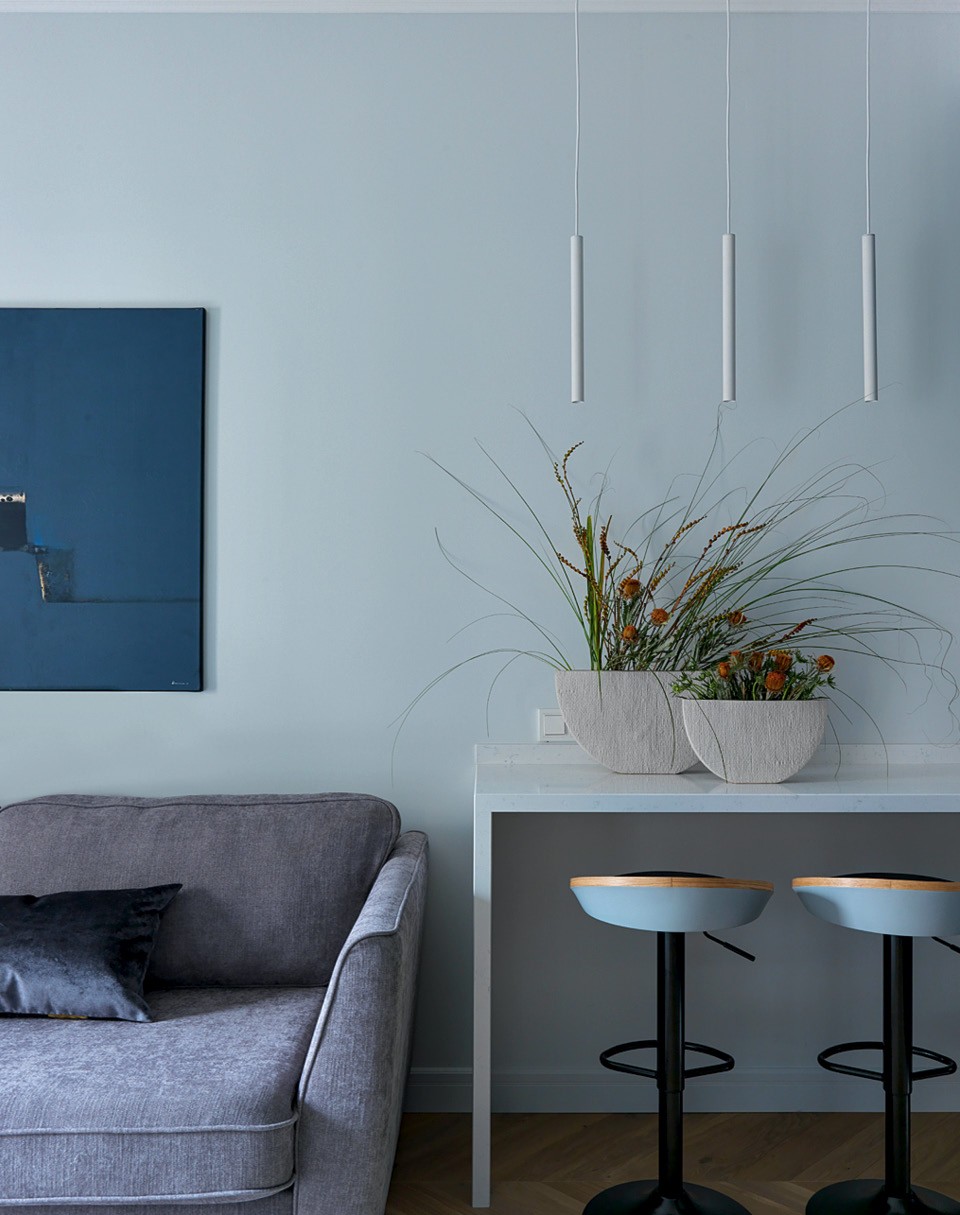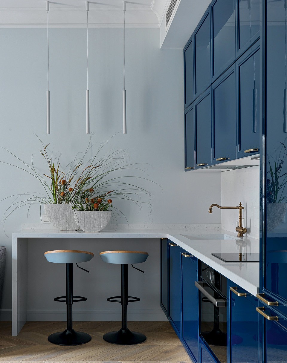 Квартира находится в новом доме на Павелецкой: в прямоугольник площадью 40 м² вписались небольшая спальня, кухня-гостиная и ванная комната с ванной, которая была непременным пожеланием клиентки. В прихожей расположились многочисленные системы хранения для большого гардероба заказчицы, которые встроены в стены и не загромождают пространство. На кухне нет привычного стола, зато нашлось место для барной стойки: образ жизни хозяйки не предполагает частых обедов-ужинов дома. Кухня с насыщенно-синим фасадом привносит в интерьер цвет, а глянцевая поверхность отражает свет, делая пространство визуально чуть больше и сложнее. Кроме кухни цвет появляется в ванной комнате, где часть стен выкрашена в теплый брусничный оттенок.