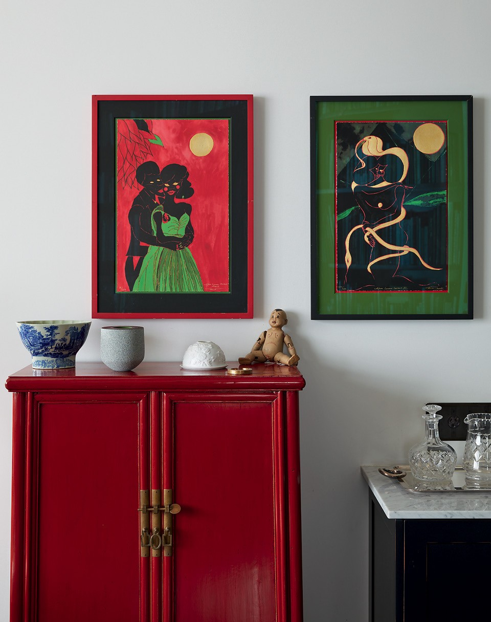 Фрагмент гостиной. Шкаф привезен из Гонконга; на нем куколка из Бирмы и китайская ваза XVI века; на стене работы Криса Офили.