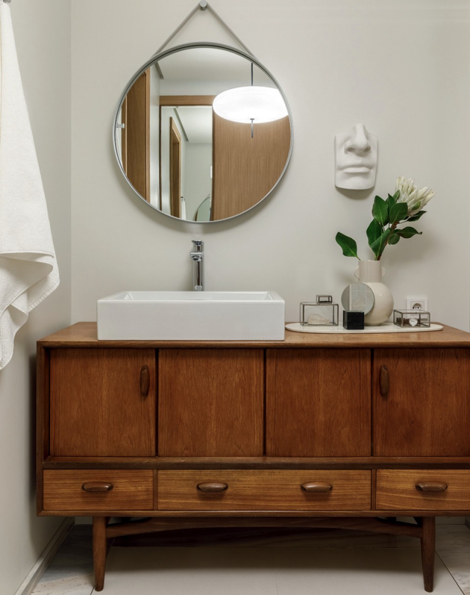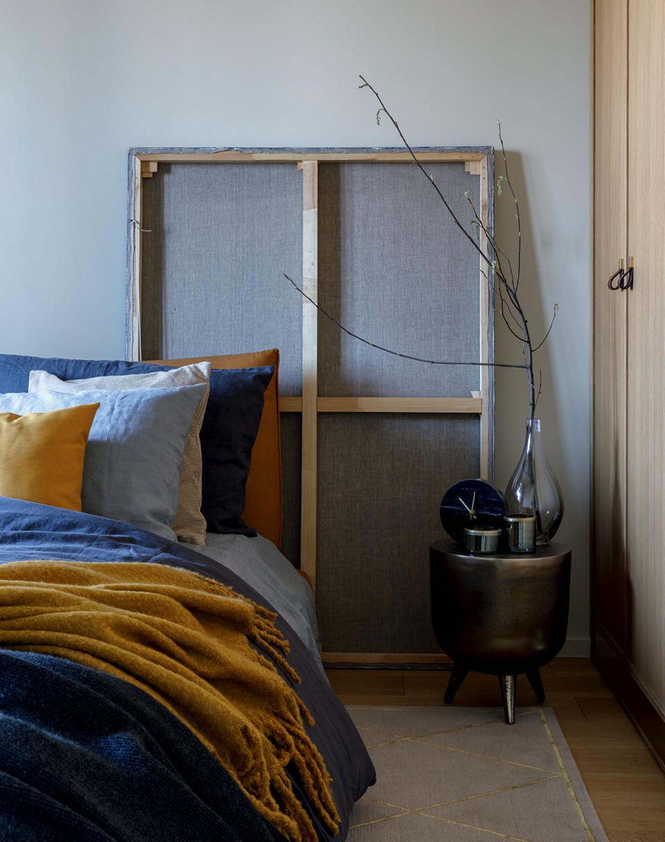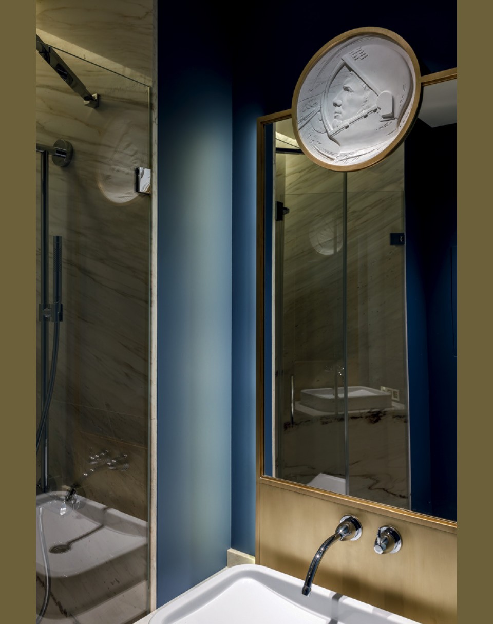 Гостевой санузел получился совсем небольшим, и дизайнер решила выкрасить стены в насыщенный темный цвет — этот прием позволил размыть границы пространства. Главным акцентом здесь стал барельеф с изображением Юрия Алексеевича Гагарина: это был единственный элемент декора, на котором настоял заказчик. Несмотря на скромную площадь, Екатерине удалось учесть все пожелания хозяина. Дополнительное спальное место она разместила в гардеробной: там стоит компактный диван, который легким движением руки трансформируется в кровать. В квартире есть и еще один сюрприз: одна из створок шкафа в спальне оказывается дверью в ванную комнату. “Когда она открыта, кажется, словно это портал в Нарнию”, — смеется Екатерина.