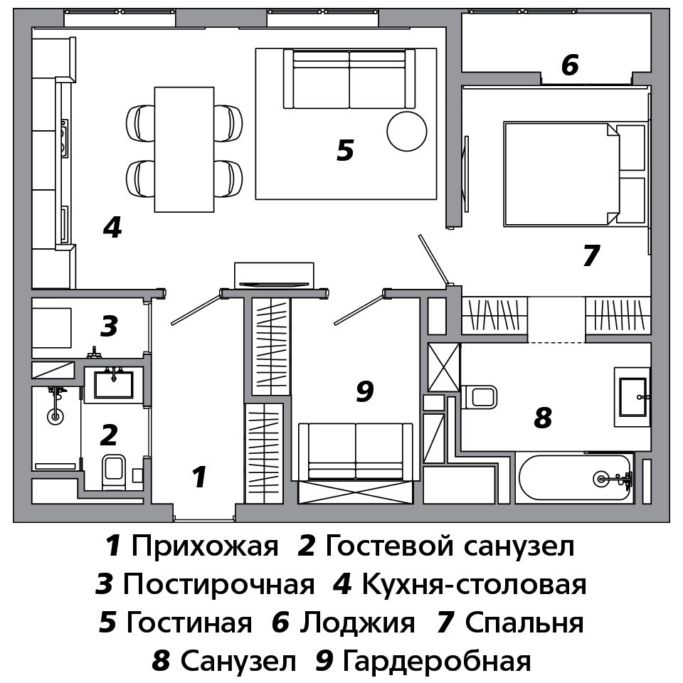 Заказчик живет в другом городе, много путешествует, и новая квартира в Москве должна была стать своеобразным перевалочным пунктом, где по необходимости можно оставлять часть багажа. В то же время хозяин дал понять, что к нему могут заглядывать друзья и родители, поэтому в квартире необходимо обустроить дополнительное спальное место и гостевой санузел.