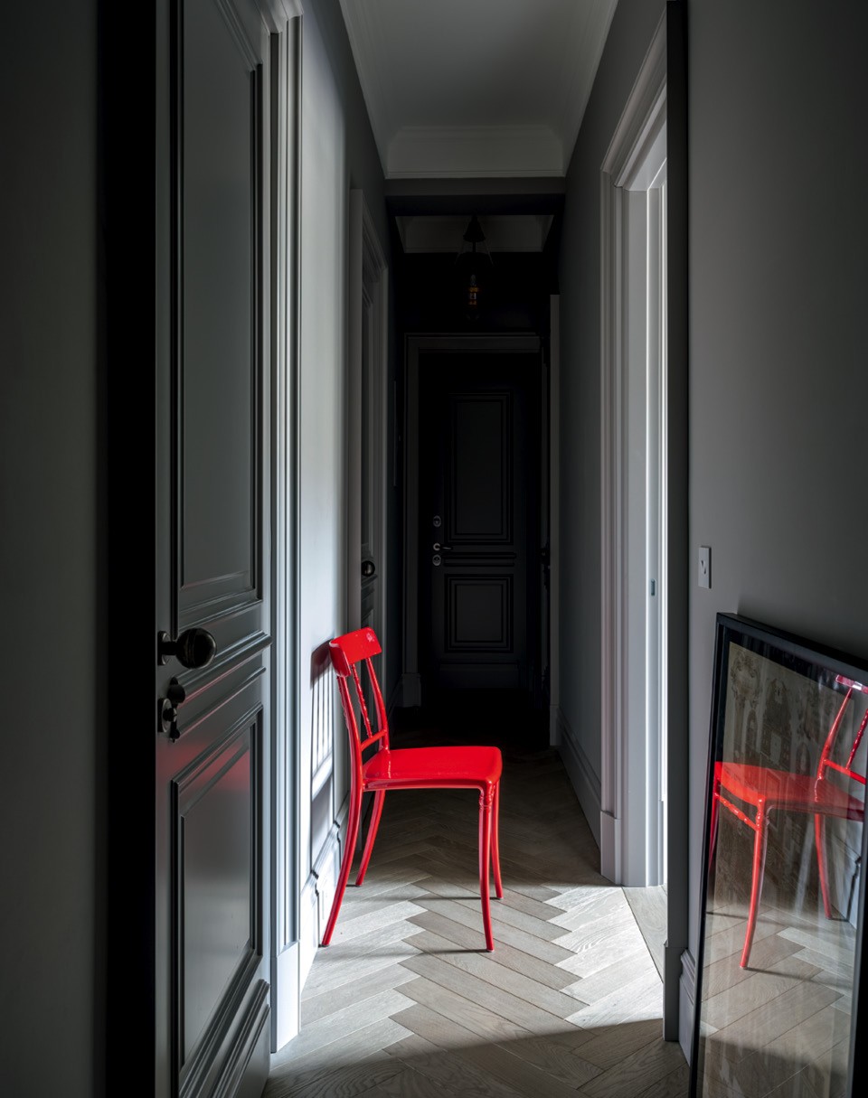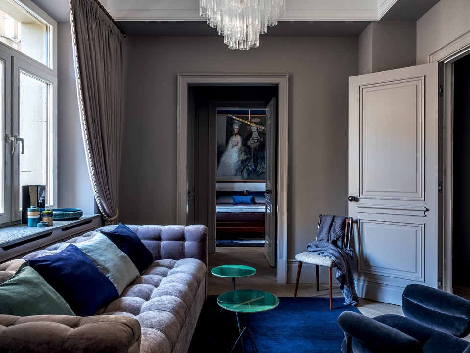 Вид из гостиной на гардеробную и спальню. На переднем плане диван, Vanguard Furniture; столики, Baxter; аксессуары из L’appartement; стул 1960‑х годов; ковер, The Rug Company. Двери и встроенная мебель сделаны на основе оригинальной столярки на заказ. Стены выкрашены краской от Farrow & Ball.