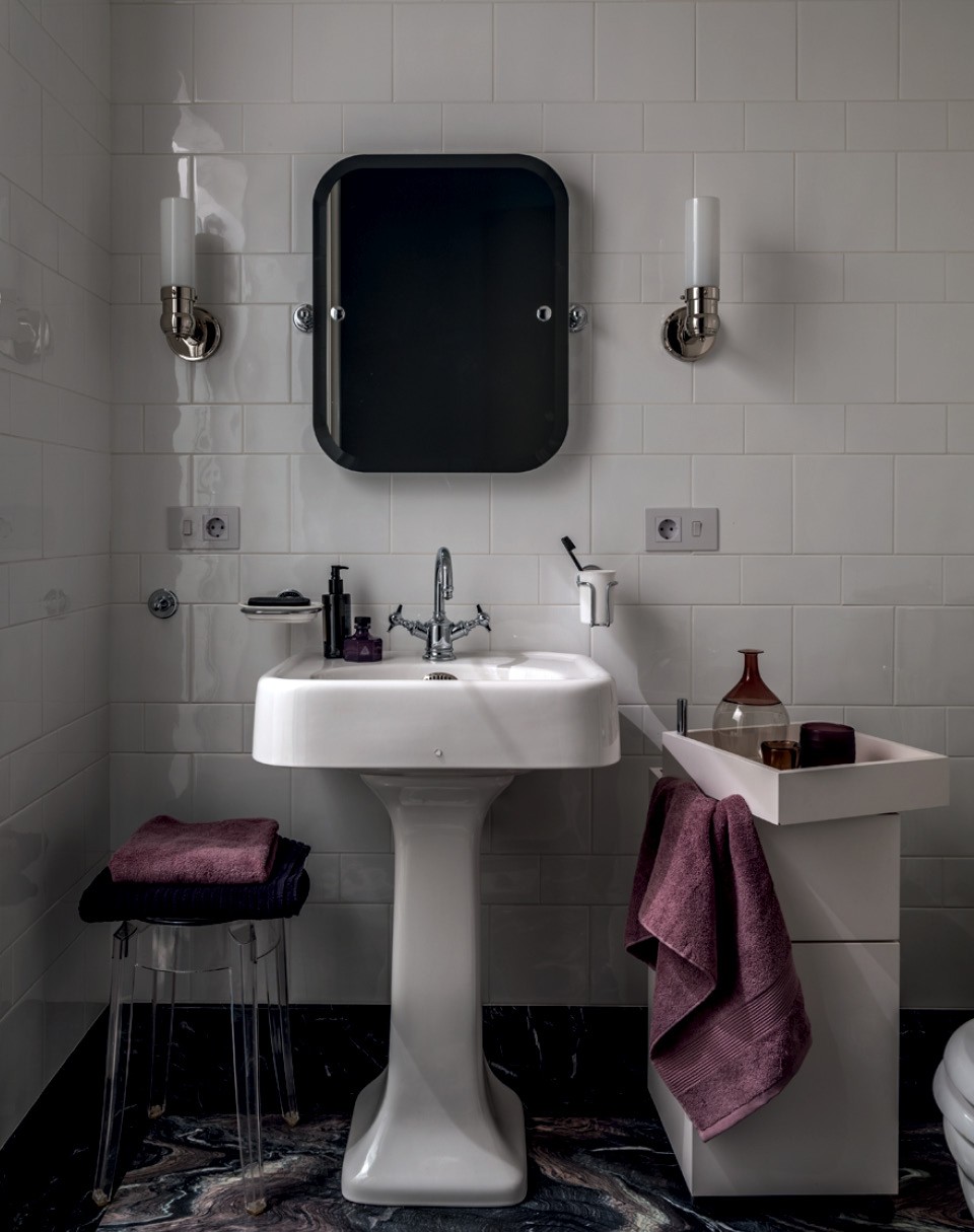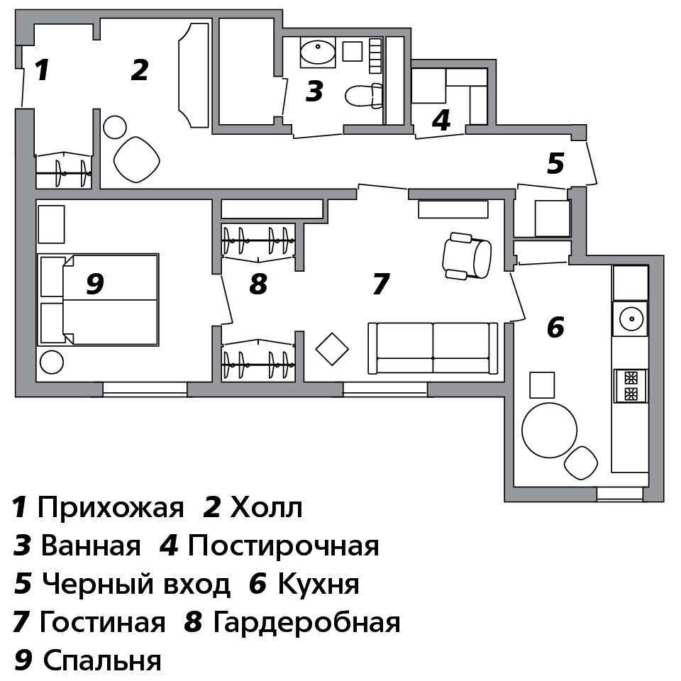 Но сложнее всего пришлось с перепланировкой: у хозяйки были очень четкие пожелания к функционалу пространства. Чтобы воплотить эти замыслы, дизайнер урезала холл и за счет него расширила ванную, бывший туалет превратила в постирочную, а часть гостиной отдала под проходной гардероб, выстроив небольшую анфиладу (см. план). На кухне Ольга отказалась от навесных шкафчиков, заменив их кладовкой, встроенной на месте коридорчика, который раньше вел на черную лестницу. Сделано это все настолько ювелирно, что на финальном этапе пришлось даже составлять план транспортировки мебели в квартиру. “Выдохнула, только когда все встало на свои места”, — говорит Ольга.