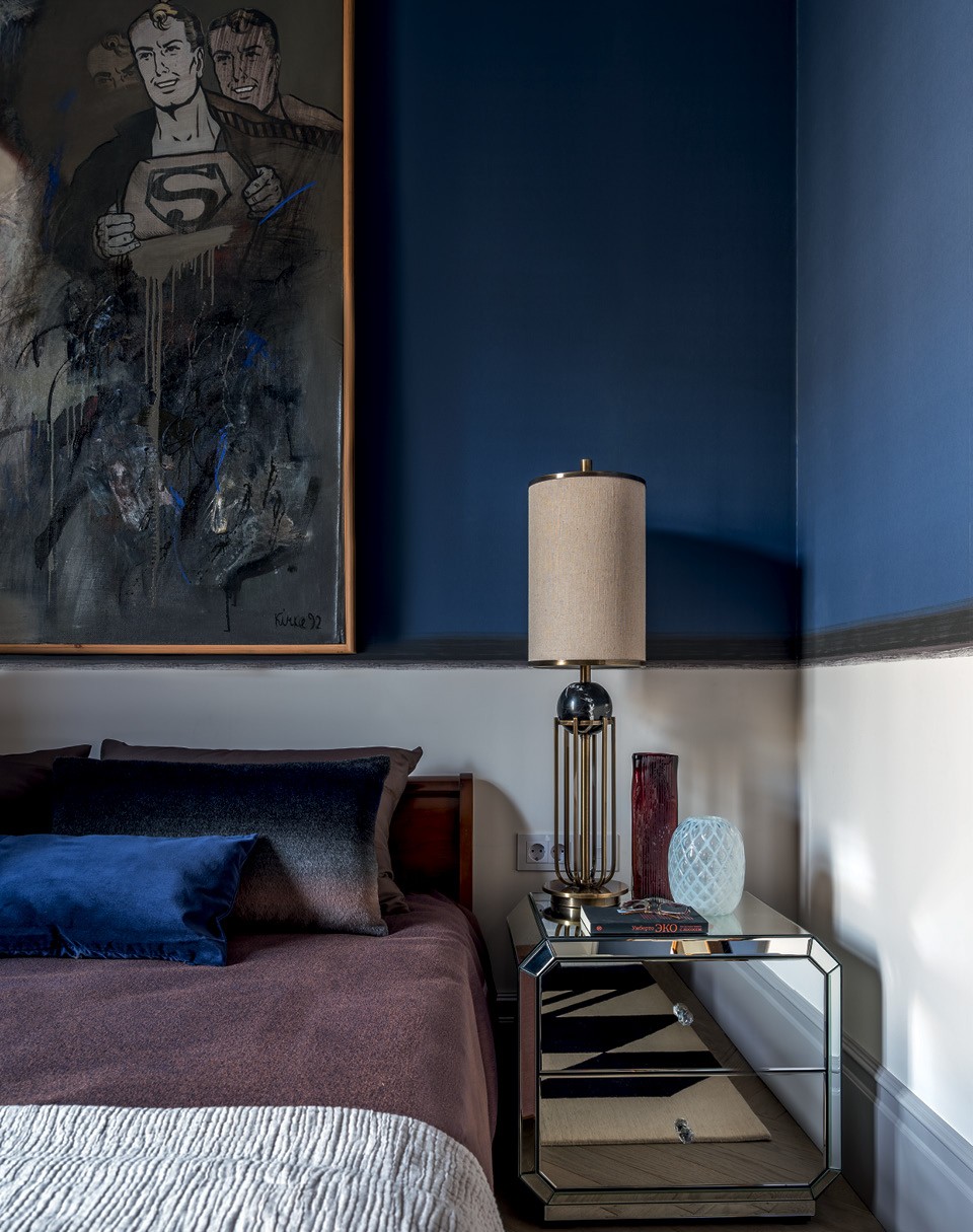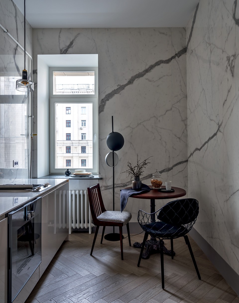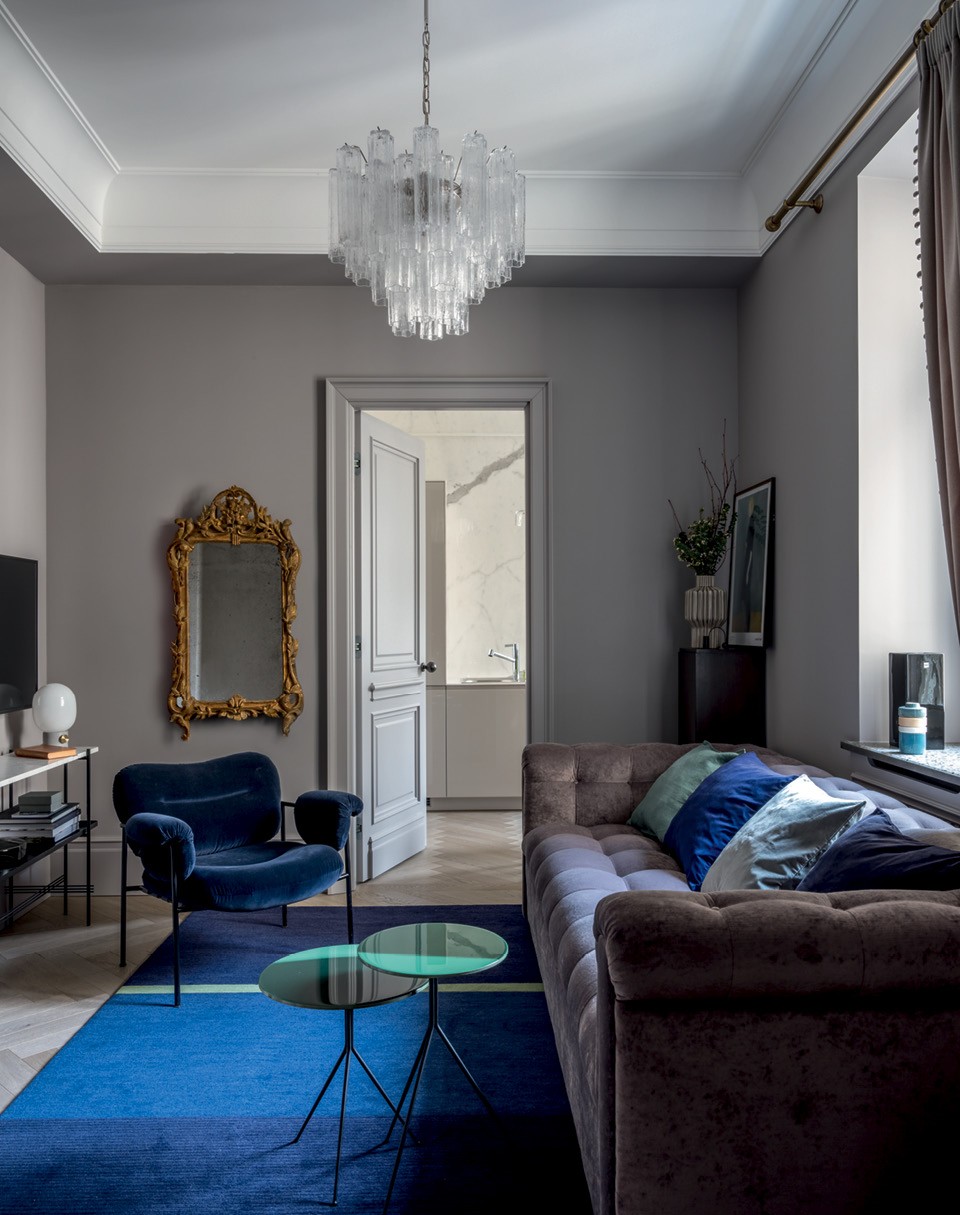 Ремонта здесь не было с 1960‑х годов. “Кухня с газовой колонкой и бельевыми веревками под потолком, узкий коридор, отошедшие от стен обои”, — так Ольга описывает свою первую встречу с квартирой. Старинные двери сохранить не удалось, но дизайнер сделала с них копии, а также взяла их рисунок за основу для встроенных шкафов. Ольга рассказывает, что у заказчицы в голове был уже сложившийся образ будущего интерьера — на первую встречу она даже принесла нарисованный от руки план и знала, что диван в гостиной должен быть больше 2,6 м. Не меньше внимания уделялось отделке. Дизайнер с заказчицей отсмотрели несколько вариантов бетона с гранитной крошкой для подоконников, без конца делали выкрасы, чтобы подобрать цвет для стен, а потом сравнивали образцы с обивочными тканями.