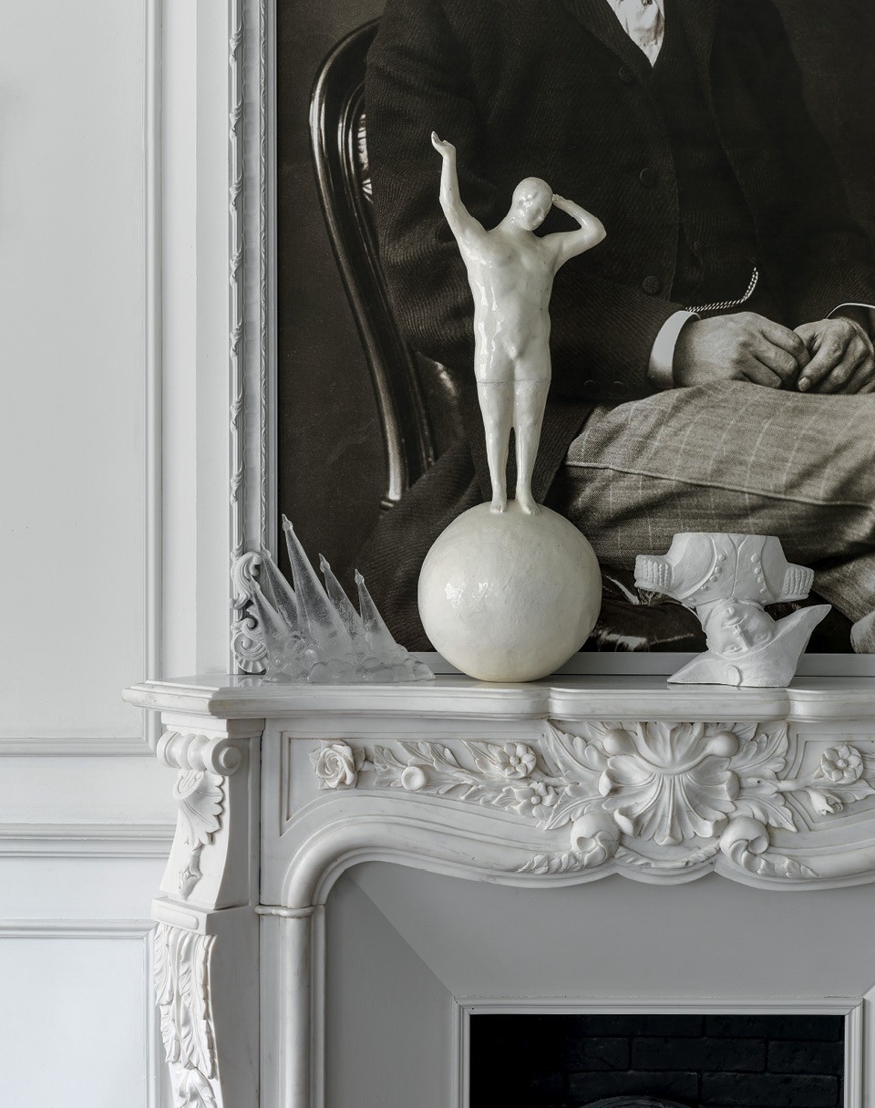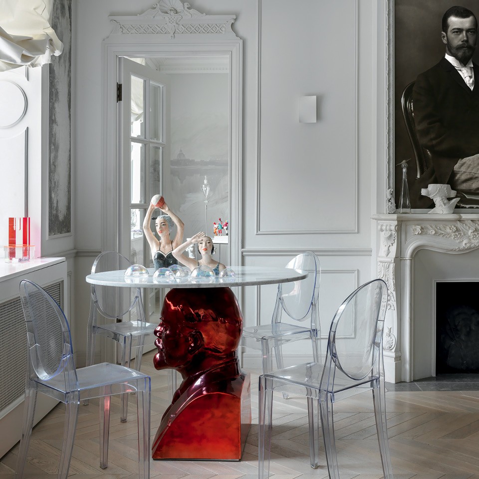 Тут целый набор клише о России, пусть даже и банальный, — начинает рассказ хозяин Прохор Машуков. — Мы сами придумали историю, что эта квартира находится в Париже, в ней живет молодой повеса, потомок русского эмигранта в третьем поколении. Его дедушка переехал в Париж в начале XX века и поселился в классической французской квартире с высокими потолками, лепниной, камином и дубовым паркетом елочкой. С собой он привез портрет Николая II, семейные иконы, старое зеркало, книжный шкаф и кровать. Нынешний жилец, хоть и не был ни разу в России, попытался создать свое представление о ней сквозь призму иронии: дворцовые люстры сделал из проволоки и винтажного хрусталя, на стенах одной из комнат изобразил балерин на фоне декораций “Русских сезонов” Дягилева, а бюсты Ленина купил на блошином рынке и сделал из них столы”.