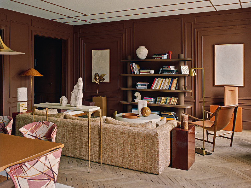 Анн-Софи Пайере признается, что не любит переделывать собственные интерьеры, ей проще найти новое жилье и начать все с нуля. В 2020 году ее большая семья справила новоселье в квартире, которая оформлена почти так же, как комната для выставки AD Intérieurs, проводившейся в Париже в 2019 году. “Я долго работала над концепцией, которая просуществовала всего пару недель, поэтому мне захотелось продлить жизнь тому интерьеру и полноценно развить идею в своей собственной квартире, — объясняет дизайнер. — Однако на большей площади я совсем отказалась от цветового разнообразия и блестящих акцентов”. В итоге все пространство выдержано в коричневых тонах — мебель, отделочные материалы и даже светильники.