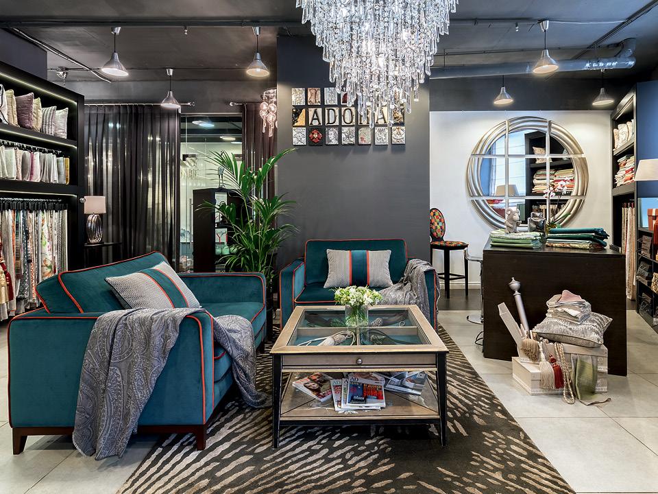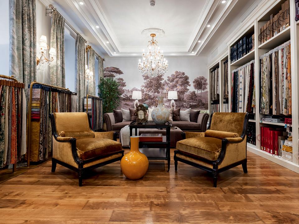 Двухэтажный салон в центре Москвы, где представлены разные ткани, мебель и аксессуары.