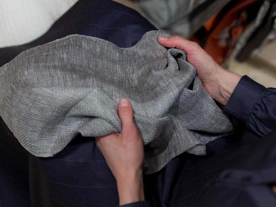 “Ткань Gio одновременно жесткая и мягкая, мне очень нравятся такие неоднозначные мятые текстуры. Я бы даже сшила себе блузу, как у Джульетты из фильма Дзеффирелли, с широченными рукавами. А во всей подборке тканей изумительные оттенки серого”.