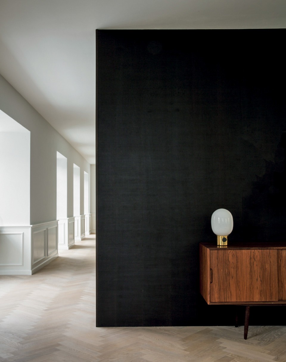 Когда-то это был летний дом дизайнера Поуля Хеннингсена, в 2014 году он пережил пожар, а несколько лет спустя был восстановлен по заказу молодой датской семьи. Хотя здесь мало что сохранилось от исторического антуража, о прошлом напоминают паркет “елочкой”, стеновые панели и оконные переплеты. Темные параллелепипеды кухни и встроенной мебели противопоставлены традиционной белой “коробке” — этот контраст подчеркивает масштаб помещения и воздух. Пространство получилось настолько чистым, что каждая мелочь, вплоть до кухонных смесителей, выглядит объемно и значимо.