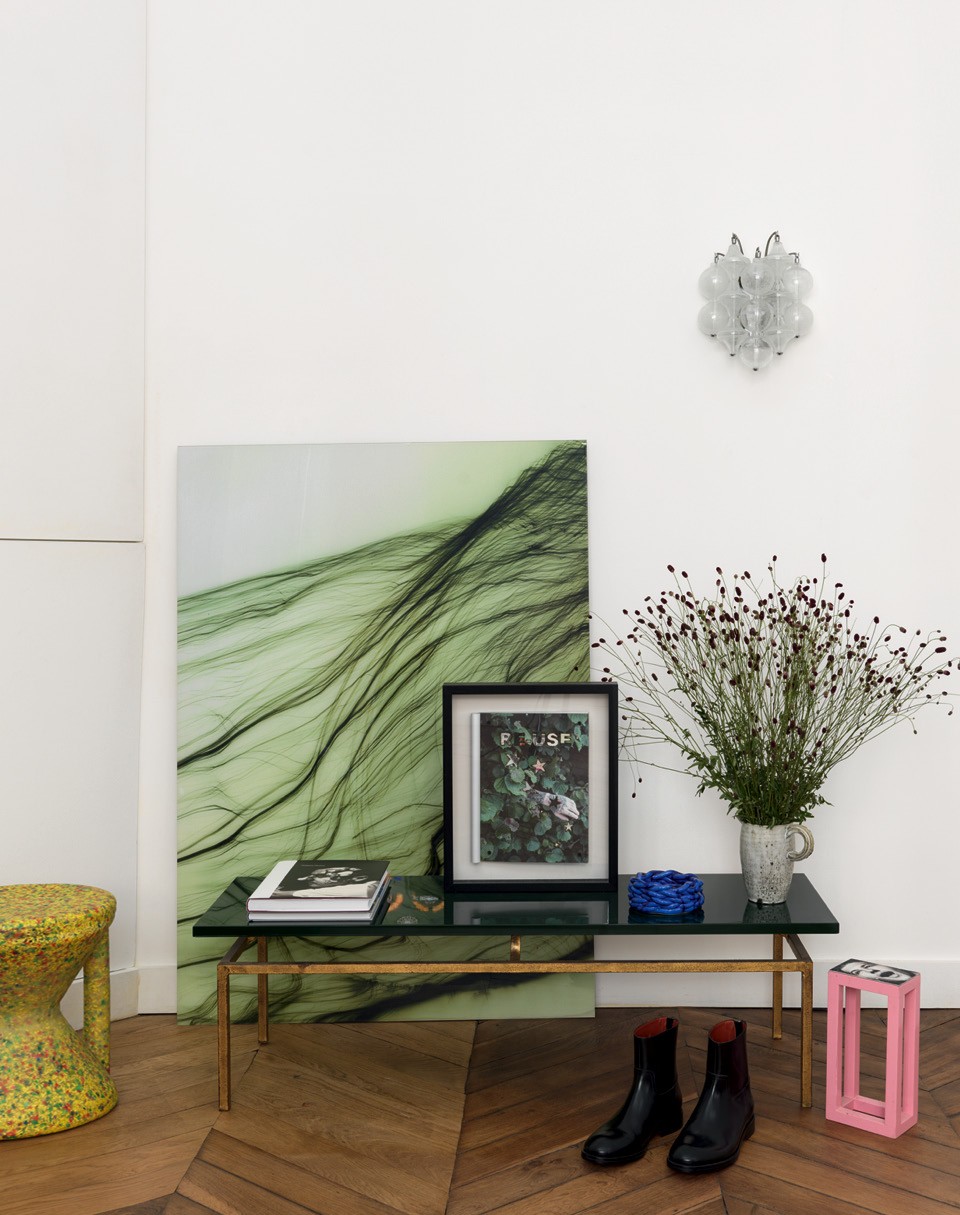 В доме Жан-Кристофа Ома вещи на одном месте подолгу не задерживаются. “Здесь нет ничего постоянного, — говорит он. — Я никогда не ставлю точку. Считайте, что это мой девиз”. Для него собственное жилище — что-то вроде лаборатории, где он оттачивает свое профессиональное мастерство. “Не могу воспринимать свой дом в отрыве от работы”, — признается Ома, который специализируется на организации мероприятий для люксовых брендов. Когда-то он работал в штате компании Louis Vuitton под началом Марка Джейкобса, а сейчас у него своя фирма, которой он — с его вечной тягой к переменам — недавно дал новое имя: Singular. Среди клиентов Ома — Celine, Dior и Boucheron, а если вы спросите его о самых любимых проектах, то он непременно вспомнит, как наводнил живыми овцами парижский универмаг Printemps и закидал бутик Джона Гальяно кучей мелко нарезанной бумаги. Иногда отдельные части этих безумных инсталляций переезжают к нему домой — именно так в прихожей оказался розовый табурет: он, вообще‑то, был придуман специально для ужина, который давал один из парижских фэшн-брендов.