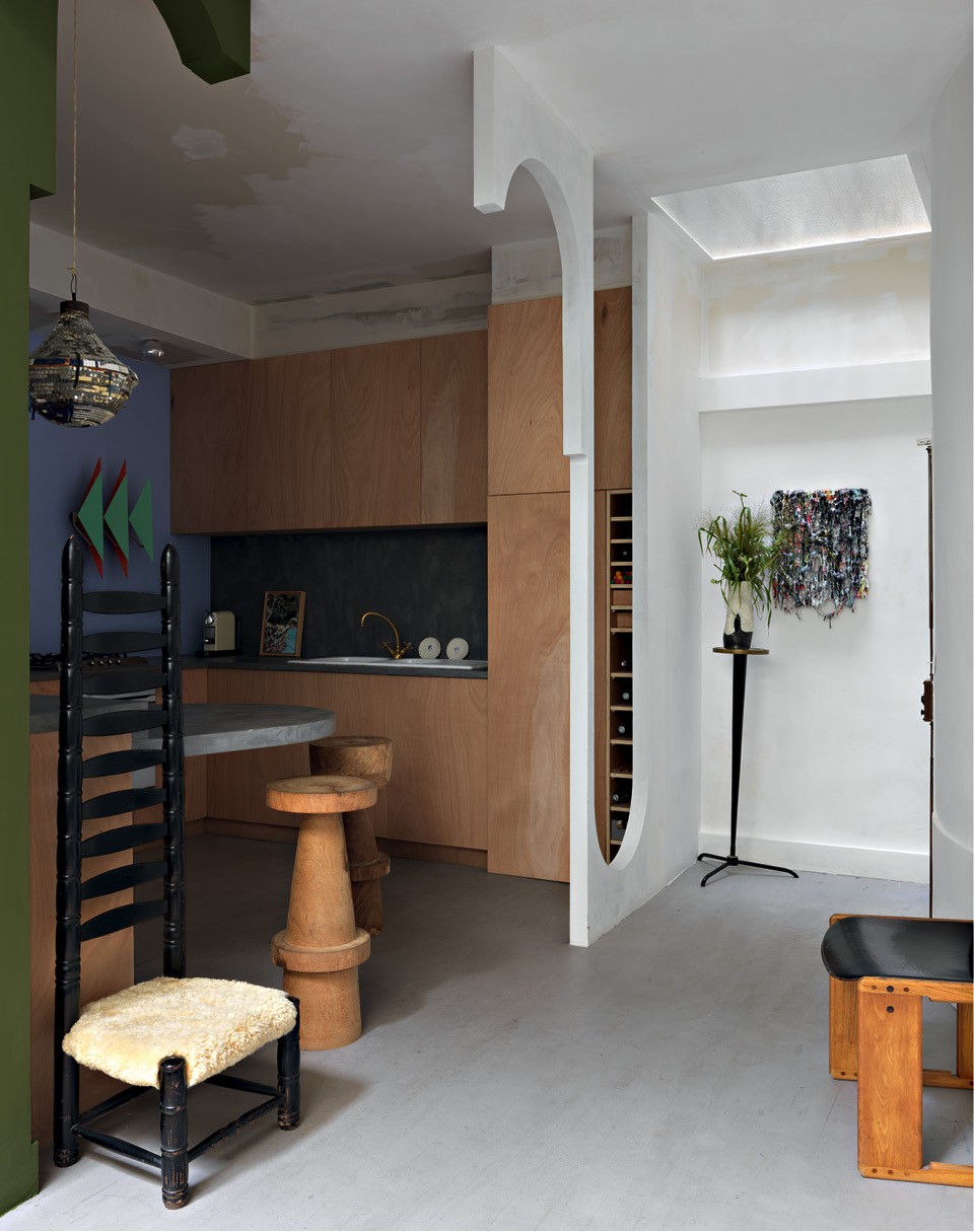 В остальном интерьер получился совершенно эклектичным. Ома родом с юга, детство провел в Экс-ан‑Провансе, и в интерьере кухни и ванной чувствуется средиземноморское влияние, правда не французское, а греческое. Рисунок оконных витражей получил продолжение в многочисленных арках. А мебель частично переехала сюда со старой квартиры: это стулья 1970‑х годов из кожи и латуни, когда‑то купленные Жан-Кристофом на брюссельском блошином рынке, и большой кожаный диван по дизайну Винченцо де Котииса. “Он похож на скульптуру, — говорит Ома. — Такие вещи не боятся времени”. Еще одна страсть нашего героя — керамика. Он хранит дома коллекцию Not a Sports Club датского дизайнера Фредерика Ниструп-Ларсена, который сделал из глины реплики популярных спортивных трофеев. “Эти фигурки выглядят так, словно их вылепил ребенок”, — считает Ома.