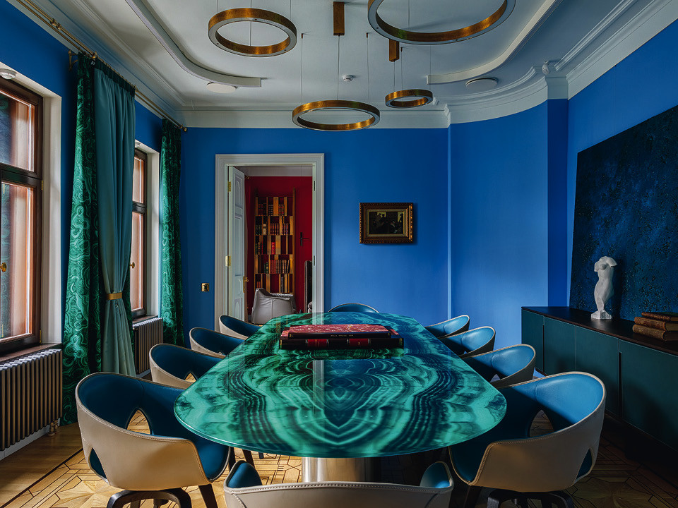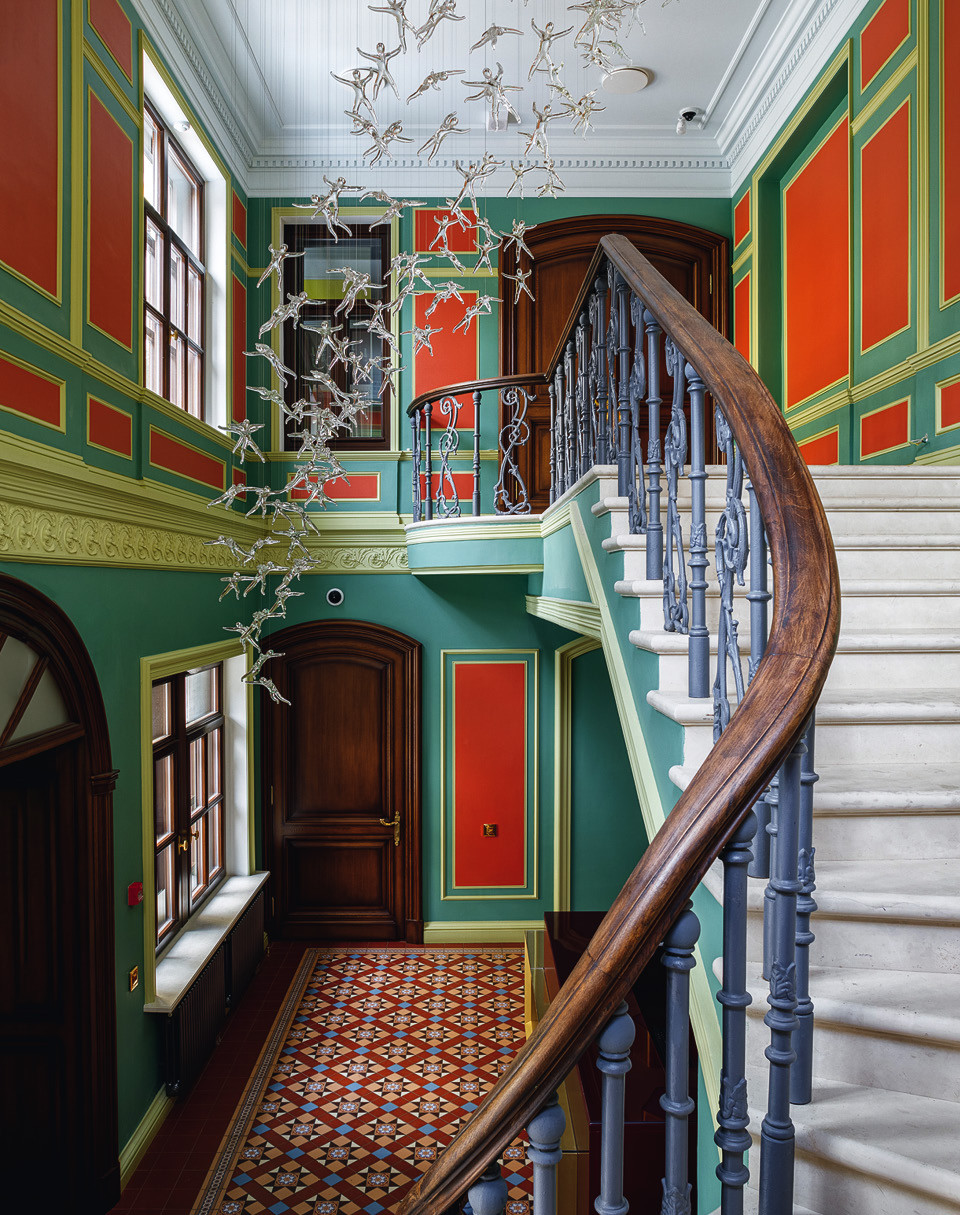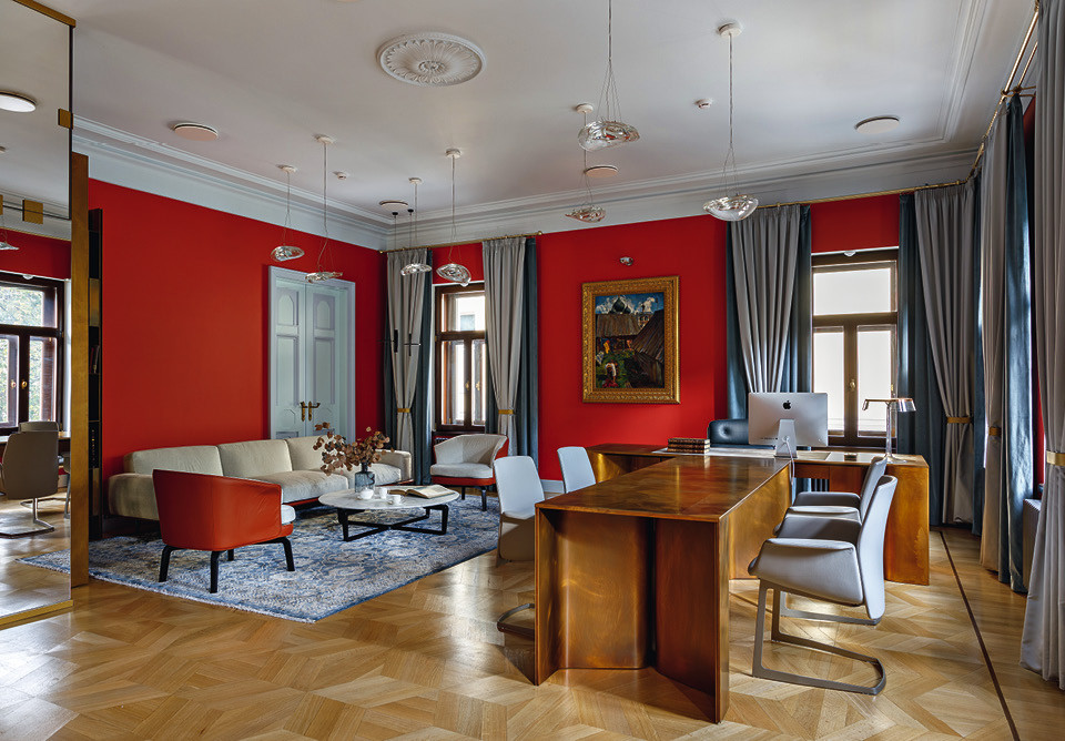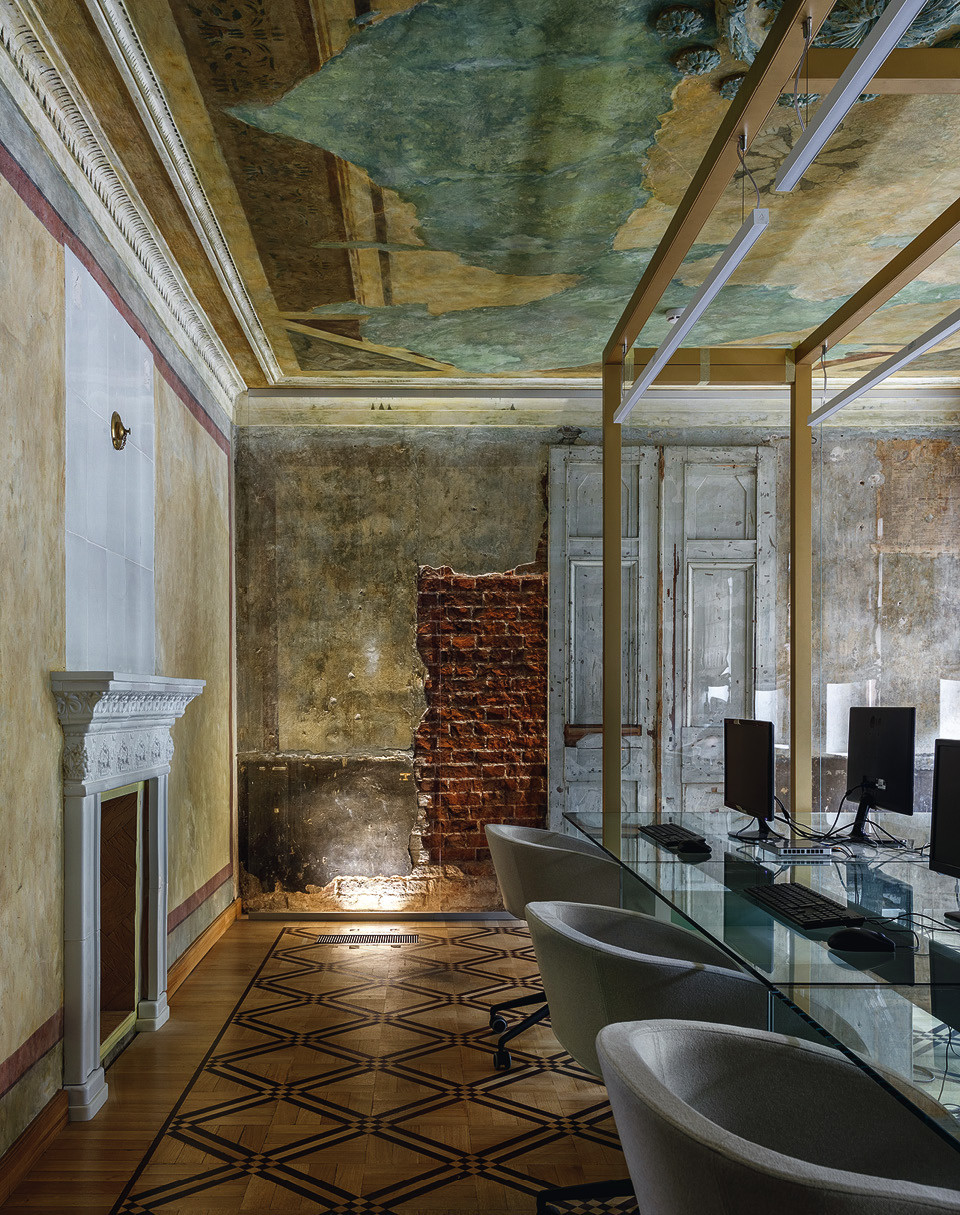 Особняк, доставшийся в работу архитектору Марианне Петренко, хоть и является объектом культурного наследия, был в очень плохом состоянии. Первые два года Марианна вместе с командой реставраторов изучала само здание и архивы, чтобы понять, что здесь было раньше. Архитектор не впервые работает с историческими зданиями, ей очень нравится тщательная и неторопливая реставрационная работа, когда под многочисленными слоями штукатурки и краски находятся оригинальные цвета и элементы отделки. Собственно, благодаря этим находкам и немногочисленным фотографиям архитектору и ее команде удалось восстановить изначальный облик особняка. И именно от этой базы начали выстраивать современный интерьер. “Все цвета, которые мы использовали, — исторические, — рассказывает Марианна. — Еще под слоями других напольных покрытий мы нашли паркет, но он был в таком плохом состоянии, что восстановить было невозможно, поэтому мы заказали новый, с точно таким же рисунком. А вот лепнина сохранилась благодаря потолкам из гипсокартона, которые ее закрывали”. Оригинальные распашные двери остались всего одни, их перенесли на нижний этаж, где сидят сотрудники, и закрыли музейным стеклом. Вообще один из офисов внизу — настоящая находка для любителей понаблюдать за историей вживую, все стены здесь просто расчищены до изначального покрытия и законсервированы от разрушения. “Расчищая эти стены, мы нашли даже газету 1789 года, которая служила подложкой под обои”, — вспоминает архитектор.