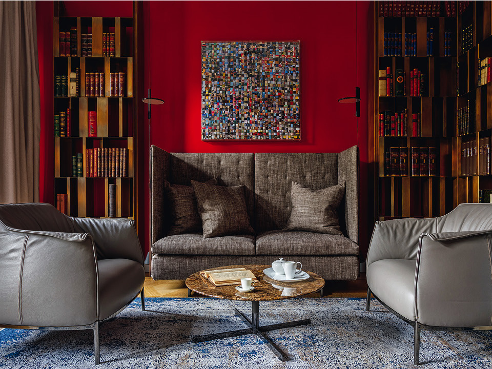 В этом особняке есть еще одна историческая деталь, правда, уже привнесенная. Заказчик коллекционирует книги времен Октябрьской революции, и его собрание хранится здесь же, в библиотеке, — именно поэтому ее стены стали насыщенного красного цвета.
