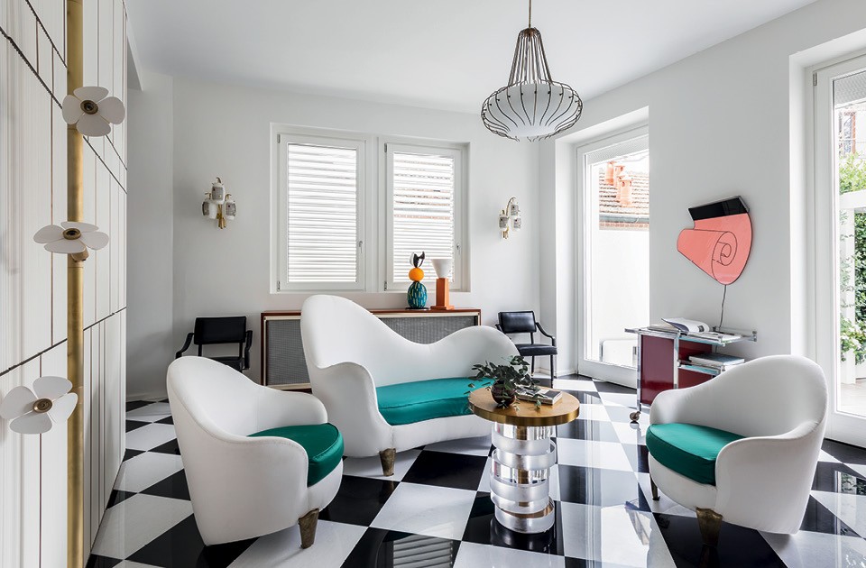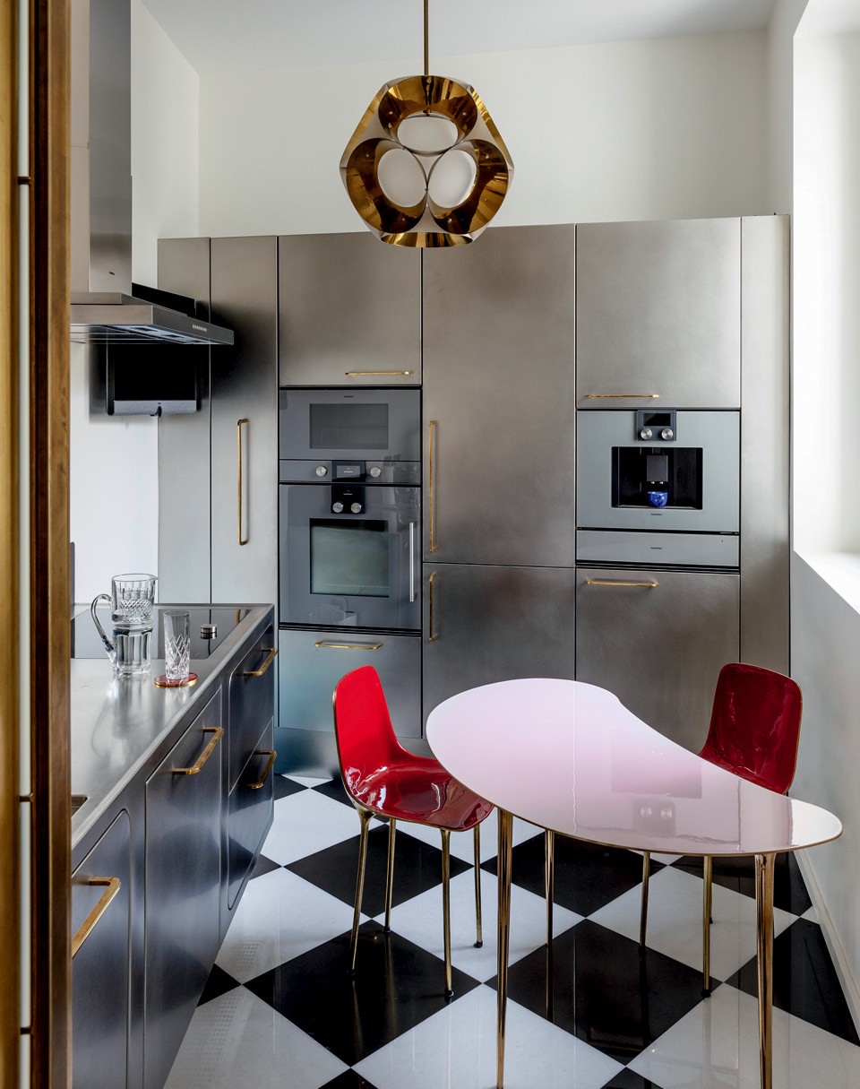 Предполагая, что обстановка в квартире будет образцово-показательной и ей нужен хороший фон, Анна-Мария выкрасила все стены в глянцевый белый цвет, а пол выложила отполированными до блеска мраморными плитами в шахматной раскладке. “Найти идеальные черные и белые слэбы было непросто, но мне так хотелось, чтобы пол в моей квартире впечатлял и был таким же графичным, как в вечернем шоу Saturday Night 1970‑х годов”, — рассказывает Анна‑Мария.