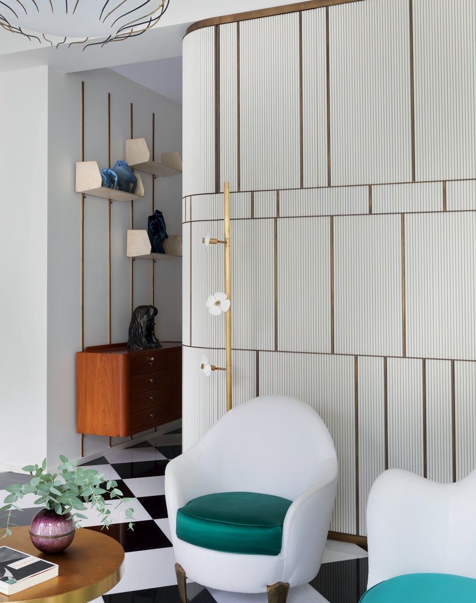 Ее тяга к перфекционизму и сценическим эффектам объясняется тем, что она бывшая балерина. Это пространство она превратила в роскошные декорации для своей повседневной жизни и коллекции предметов, которые успела собрать. “Мне хотелось, чтобы в моей квартире все меня восхищало, а каждая зона была особенной, поэтому даже в ванной мы повесили люстры, которые обычно не используют во влажных зонах”, — объясняет хозяйка. Фасады всех встроенных шкафов в общей зоне будто плиссированные, а латунные детали светильников, предметов мебели и элементы отделки отвечают во всех пространствах за благородный золотой блеск.