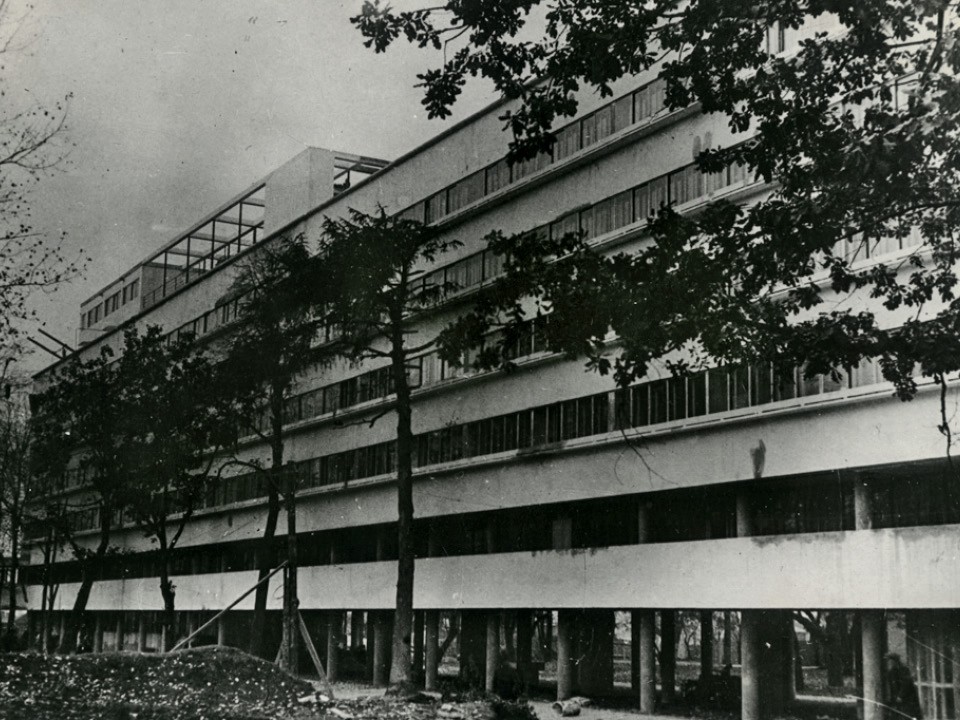 Помимо жилого блока в доме Наркомфина сразу был запланирован так называемый коммунальный центр со столовой, физкультурным залом, читальнями, отдельно — прачечная и сушильня, то есть здесь заранее было предусмотрено место для всего, без чего современному дому в городе не обойтись. Каждая из квартир — двухъярусная. В нижнем прямо от прихожих начинаются крошечные кухни и общие жилые комнаты, на втором — одна или две спальни со встроенными шкафами, ванная и туалет. Спальни смотрят окнами на восток, гостиные — на запад. Цветовыми решениями квартир когда-то занимался руководитель малярного отделения Баухауса профессор Хиннерк Шепер. Он выбрал серо-голубые оттенки для верхних ячеек, желтые и охренные — для нижних, причем и то и другое было реализовано в двух вариантах — с сильной и слабой насыщенностью колеров, в наше время такой подход назвали бы инстаграмным.