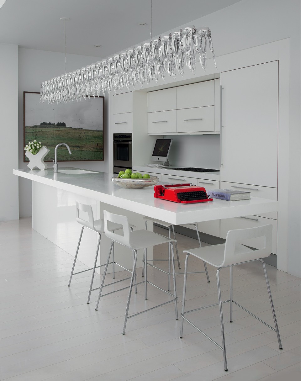В двухуровневом пространстве апартаментов обустроили все необходимые помещения: гостиную, столовую, кухню и спальню. Фактически вся площадь первого этажа — это общая зона, лишь условно поделенная на кухню и гостиную. Кухня — первое, что видит вошедший в эту квартиру. По задумке гости сначала останавливаются здесь, а уже потом проходят дальше — в ту часть комнаты, которая организована вокруг камина.