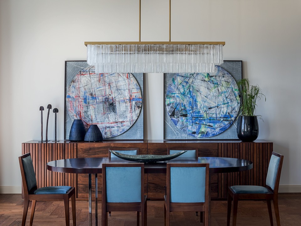 Столовая. Стол сделан на заказ; над ним светильник, Bella Figura. На комоде работы Марины Кастальской “Треугольник” и “Квадрат” из цикла “Основные” из галереи “Агентство. Art Ru”; блюдо и вазы из галереи Altagamma.