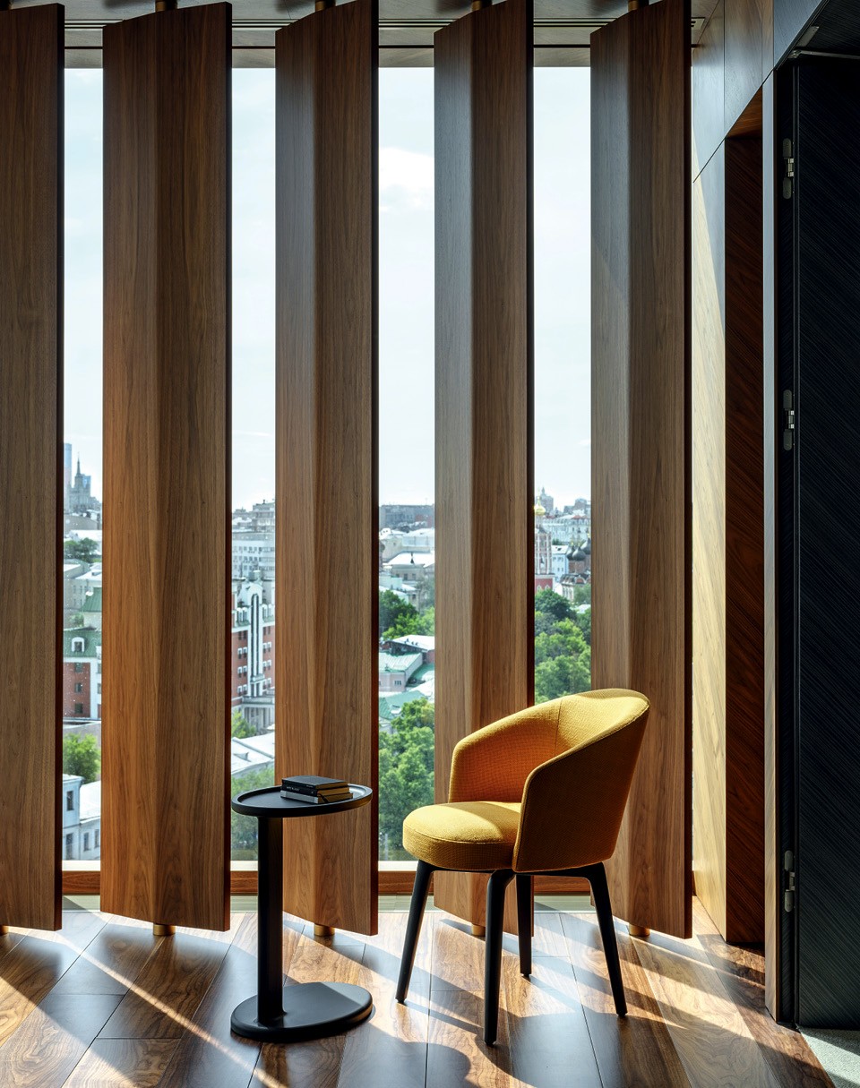 Эта квартира в жилом комплексе “Легенда Цветного” не первая работа Олеси Ситниковой для заказчика, холостого мужчины в полном расцвете сил, который решил, что хочет жить в центре Москвы и любоваться панорамой города в любое время. “Если посмотреть на дом с Трубной площади, то во всех квартирах минимум на треть закрыты шторы, потому что при таком колоссальном объеме остекления нужно отсекать солнечные лучи, иначе будет слишком жарко, да и прелести этого вида теряются”, — рассказывает Ситникова, которая придумала свой метод сохранения панорамы. Он состоит из трех компонентов: специальная защитная пленка снаружи окон, полупрозрачные рулонные шторы внутри и поворотные деревянные ламели. Пленка гасит часть ультрафиолетовых лучей и предохраняет дерево и ткани в интерьере от выгорания. Шторы изготовлены из специального полупрозрачного материала и, если их опустить, почти не влияют на вид окна. А ламели создают и вертикали в интерьере, и уют в доме — с одними рулонными шторами сложно избавиться от ощущения офисного помещения.