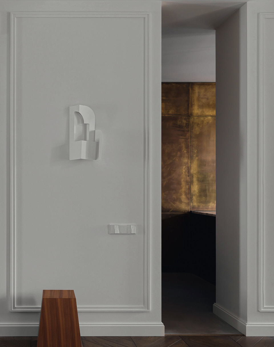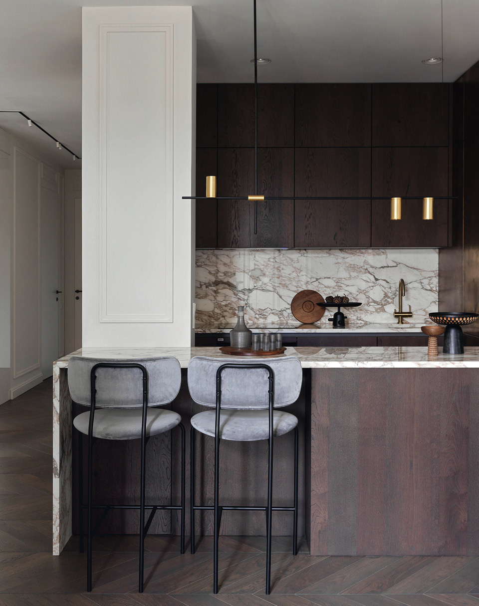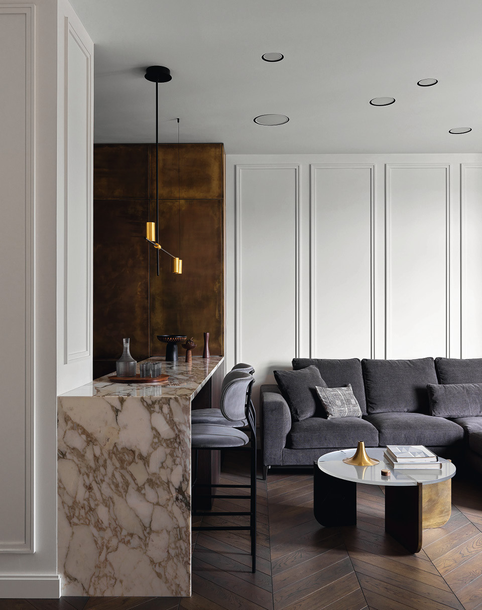Оформлением интерьеров занималась дизайн-студия Tolko Interiors, которую нашла Мария. “Это была забавная история. Мы планировали работать с другой командой, и я сохраняла фотографии из Pinterest с примерами того, что мне нравится. Оказалось, что почти все они из портфолио этих ребят”, — рассказывает она. Николай Колосков и Денис Горохов, основатели питерской студии, быстро нашли общий язык с заказчицей. “Марии был близок наш дизайнерский стиль и подход, но в то же время она хотела легкий интерьер с женственными нотками, и мы добавили классические элементы: молдинги и резные детали”, — рассказывает Николай. Они смотрятся особенно элегантно на брутальном фоне, который задают шкафы с фасадами из патинированной латуни в кухне, фактурная стена из микробетона в зоне столовой, темное дерево в отделке и минималистичная мебель в гостиной.