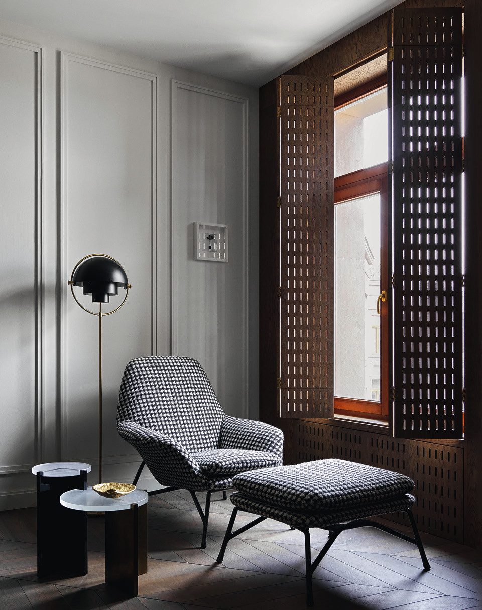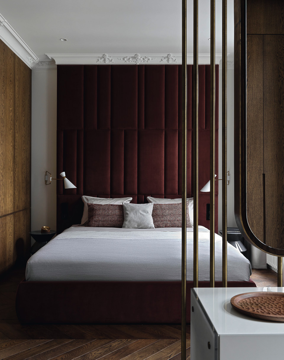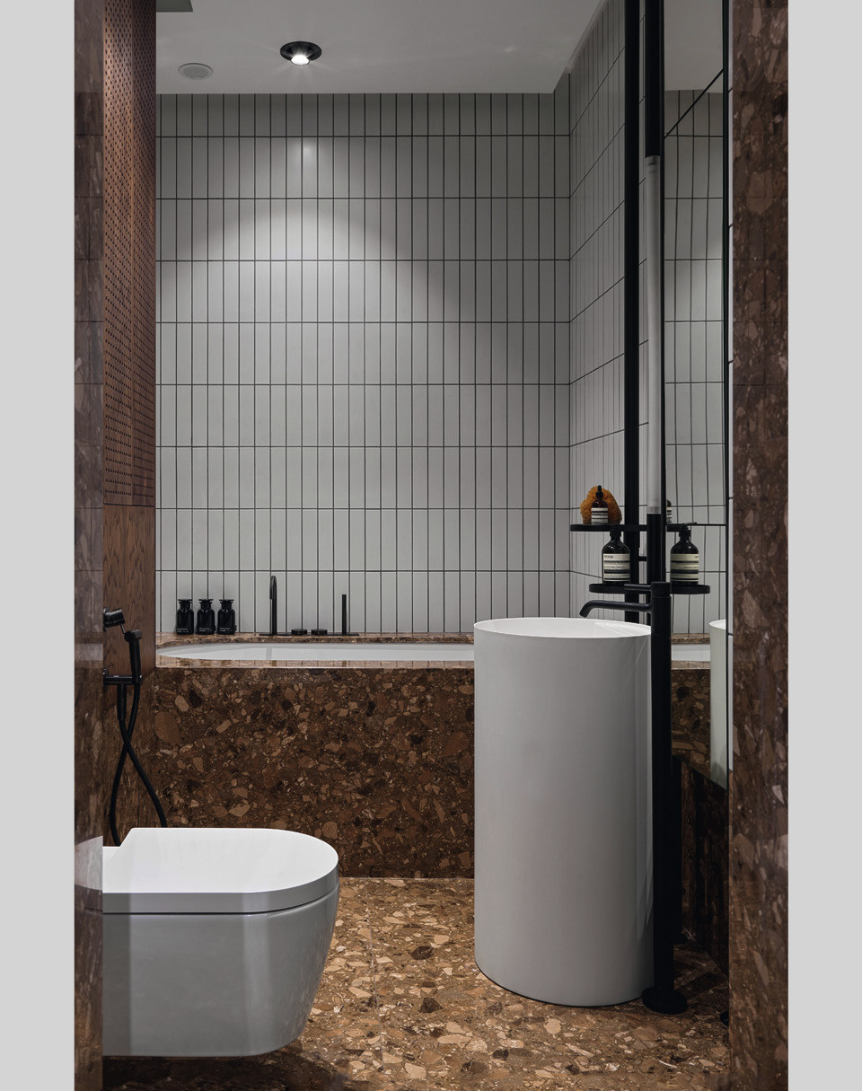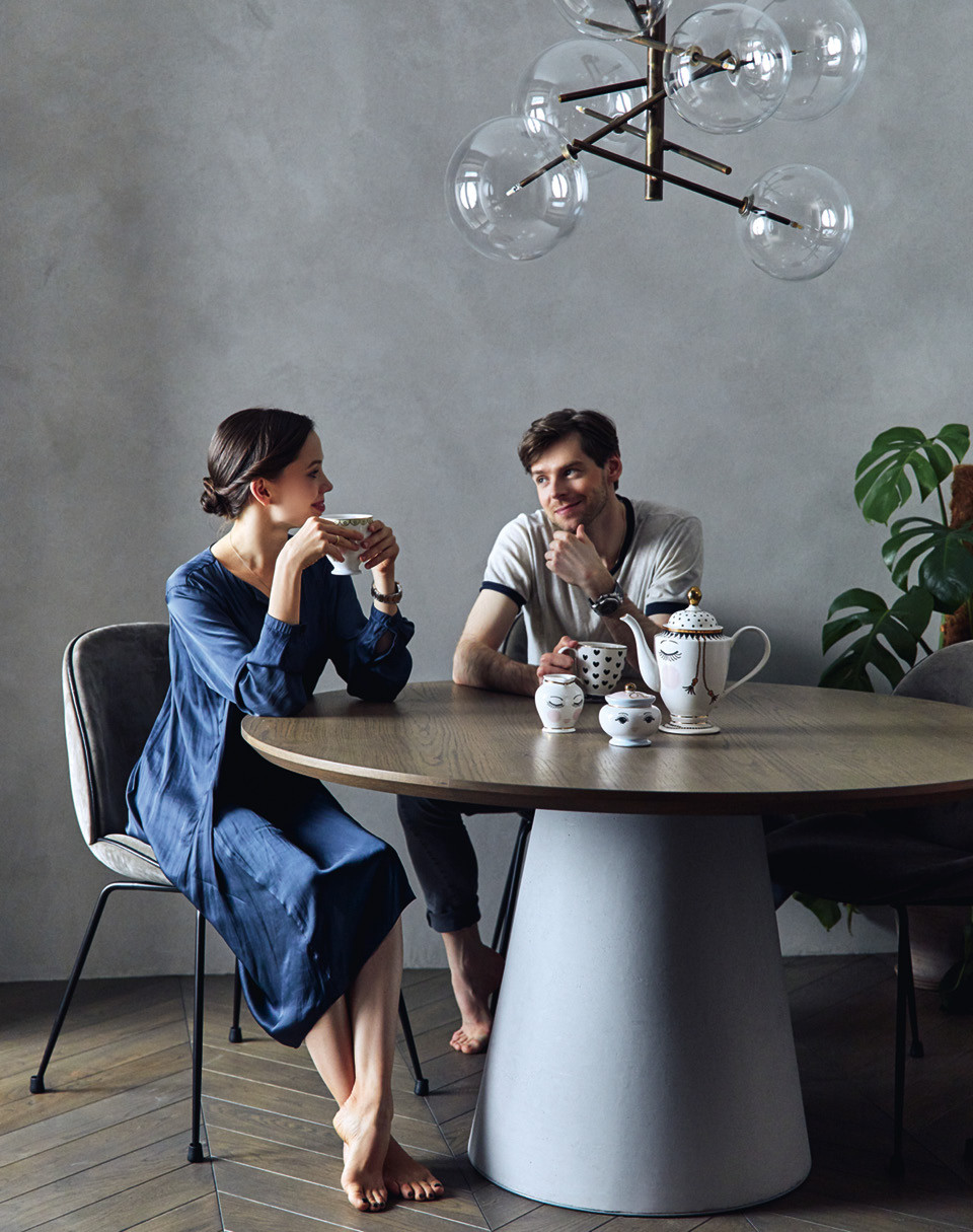 Оформлением интерьеров занималась дизайн-студия Tolko Interiors, которую нашла Мария. “Это была забавная история. Мы планировали работать с другой командой, и я сохраняла фотографии из Pinterest с примерами того, что мне нравится. Оказалось, что почти все они из портфолио этих ребят”, — рассказывает она. Николай Колосков и Денис Горохов, основатели питерской студии, быстро нашли общий язык с заказчицей. “Марии был близок наш дизайнерский стиль и подход, но в то же время она хотела легкий интерьер с женственными нотками, и мы добавили классические элементы: молдинги и резные детали”, — рассказывает Николай. Они смотрятся особенно элегантно на брутальном фоне, который задают шкафы с фасадами из патинированной латуни в кухне, фактурная стена из микробетона в зоне столовой, темное дерево в отделке и минималистичная мебель в гостиной.