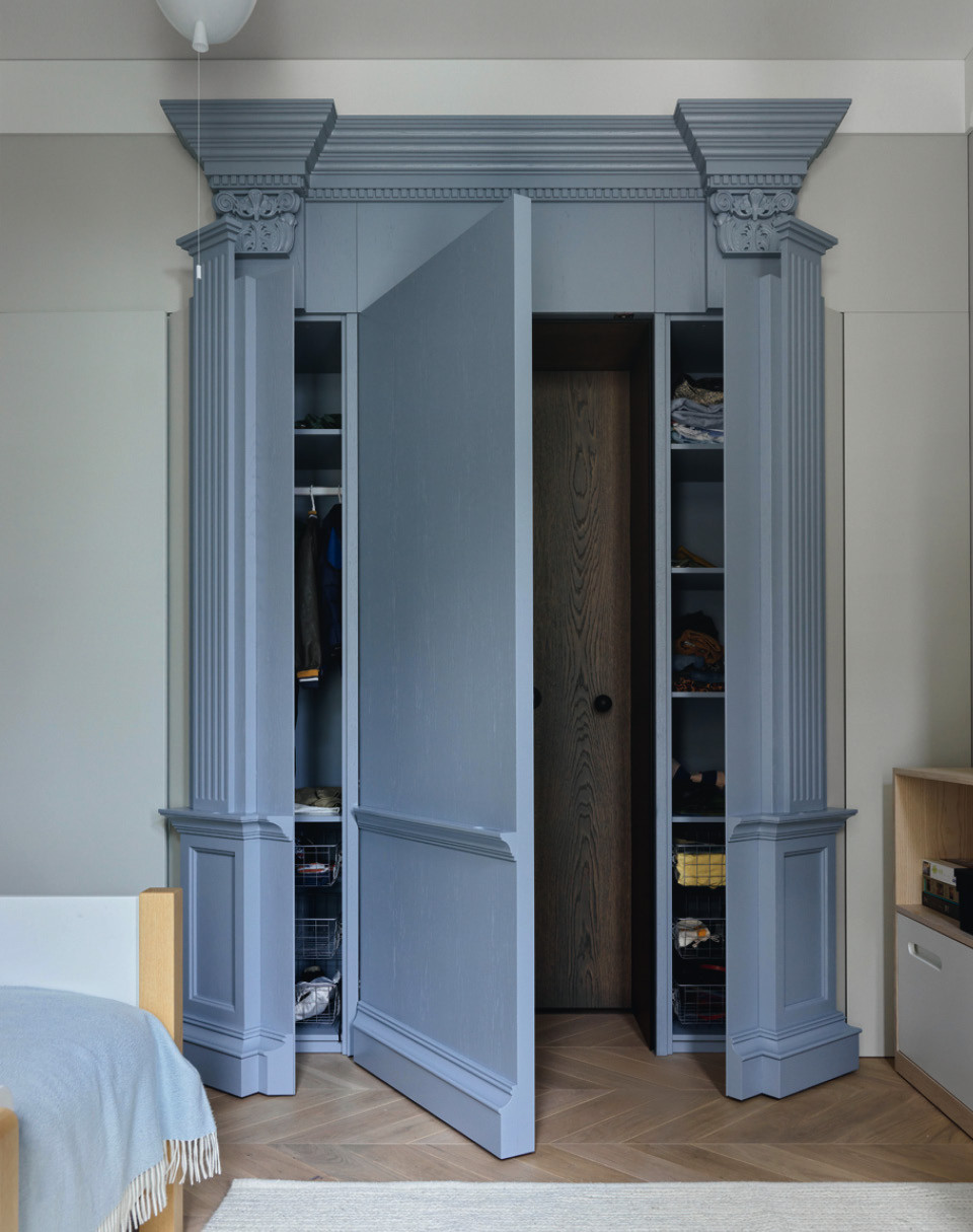 “Мы реализовывали свои задумки и прислушивались к идеям Марии. К примеру, она предложила сделать вход в комнату сына как в шкаф из фэнтези “Хроники Нарнии”, — рассказывает Николай. Со стороны коридора это массивная темная дверь, а со стороны детской — функциональная система хранения. “Для меня детская — это особое пространство, в котором живет волшебство и где благодаря фантазии любой предмет может превратиться во что угодно. Это другой мир, отличный от всей квартиры”, — объясняет Мария. По периметру комнаты пущен карниз, который вместе с портьерами, росписями на стенах и светильниками в форме воздушных шаров создает почти театральную атмосферу. “Я сам всегда мечтал о подобной детской, и подарить ее своему ребенку — счастье”, — добавляет Владимир. Еще один подарок Алеша получил на свое пятилетие от друга семьи и тренера ФК “Зенит” Сергея Семака. Футболка с номером семь, надписью Alex и автографом его любимого игрока, капитана сборной России Артема Дзюбы, займет почетное место на одной из стен комнаты. Похоже, новое жилье Владимира и Марии Шкляровых стало местом, где сбываются мечты. “Я люблю наш дом целиком: от пола до потолка, от входной двери до самого дальнего уголочка — и с удовольствием покупаю приятные мелочи, посуду и текстиль”, — радуется Мария.