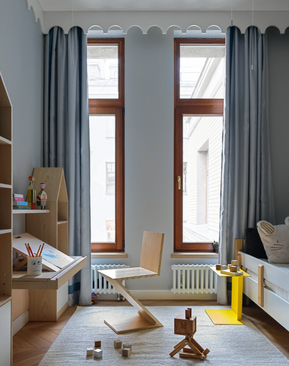 Владимир и Мария Шкляровы купили квартиру в отреставрированном доме недалеко от Мариинского театра, в котором оба работают, и с комфортом в ней обосновались. “Мы хотели создать пространство, где будем отдыхать после репетиций и выступлений, поэтому здесь нет балетного станка. Даже месяцы изоляции не заставили меня пожалеть о моем решении. Зато у нас есть просторная спальня, потому что самый эффективный способ восстановления после нагрузок — это сон”, — рассказывает хозяйка квартиры. Также здесь есть общая зона с удобным диваном и креслами, где можно расположиться вечером, и светлая, немного сказочная детская комната.