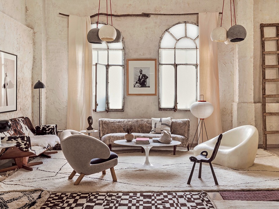 Высота стен в гостиной — около пяти метров. Они покрыты рельефной штукатуркой; для получения нужного цвета пришлось смешать три разных оттенка: чистый белый, цвет слоновой кости и охристо-белый. На переднем плане кресло Pelican по дизайну Финна Юля из галереи Batavia и трехногий стул из галереи Los Traperos de Emaos. Под окном бумажный светильник Akari10A по дизайну Исаму Ногучи, Vitra. Металлические рамы нашли на барахолке во Франции. В простенке между окнами фотография Сейду Кейта. На полу берберские ковры.