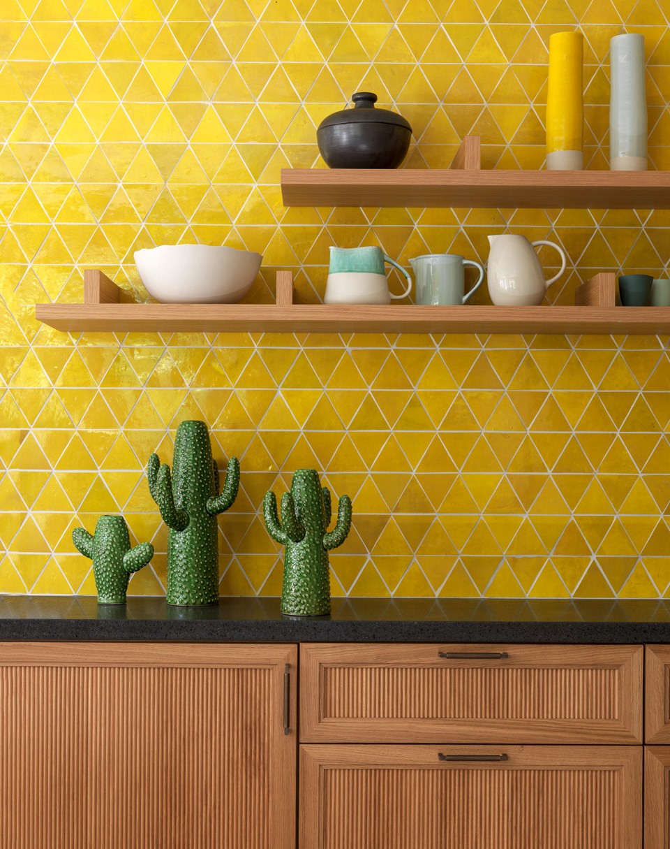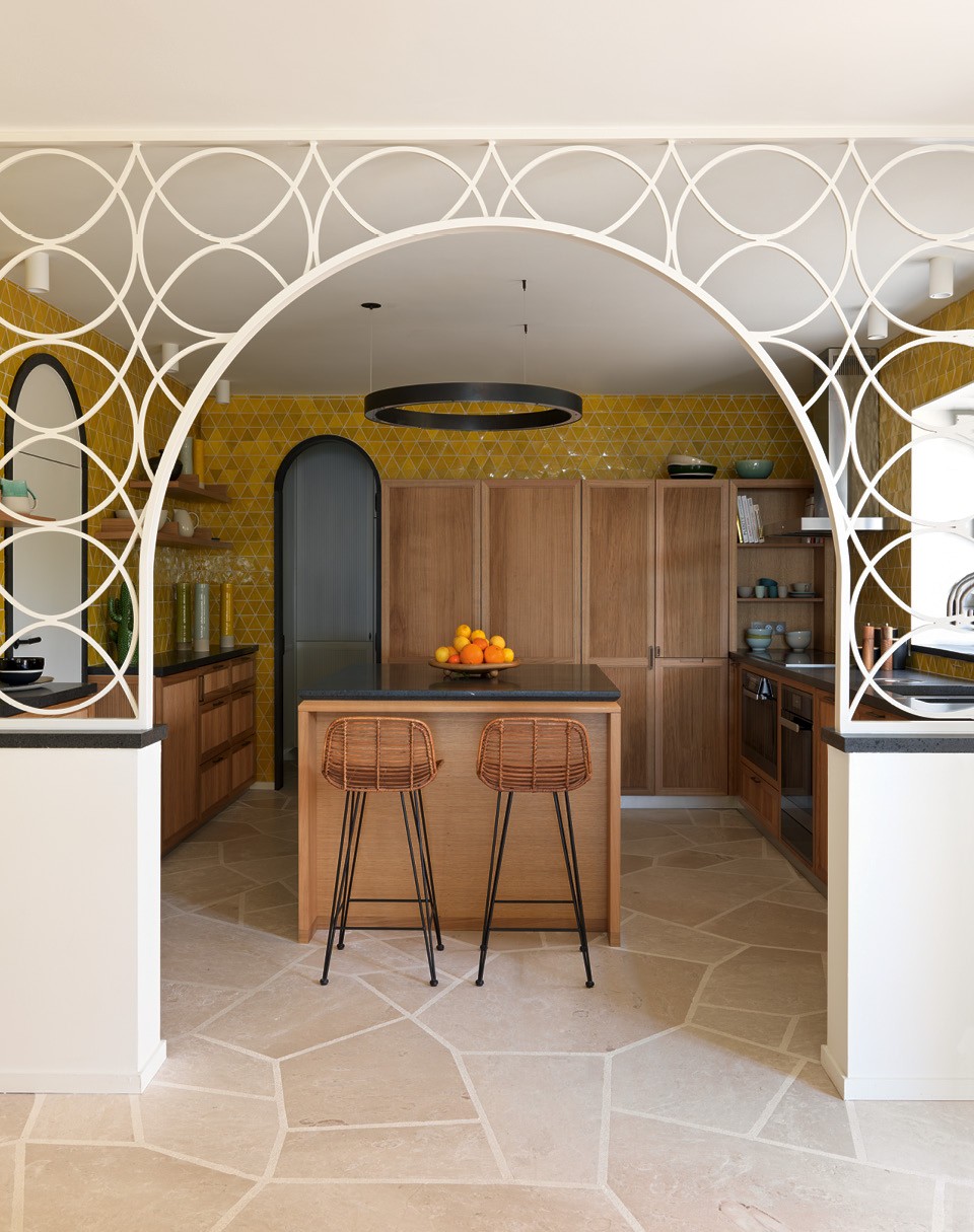 Кухня. Барные стулья, HKliving. Светильник, Henge. Столешницы сделаны из лавового камня, шкафы из дуба. Желтая плитка ручной работы из Марокко.