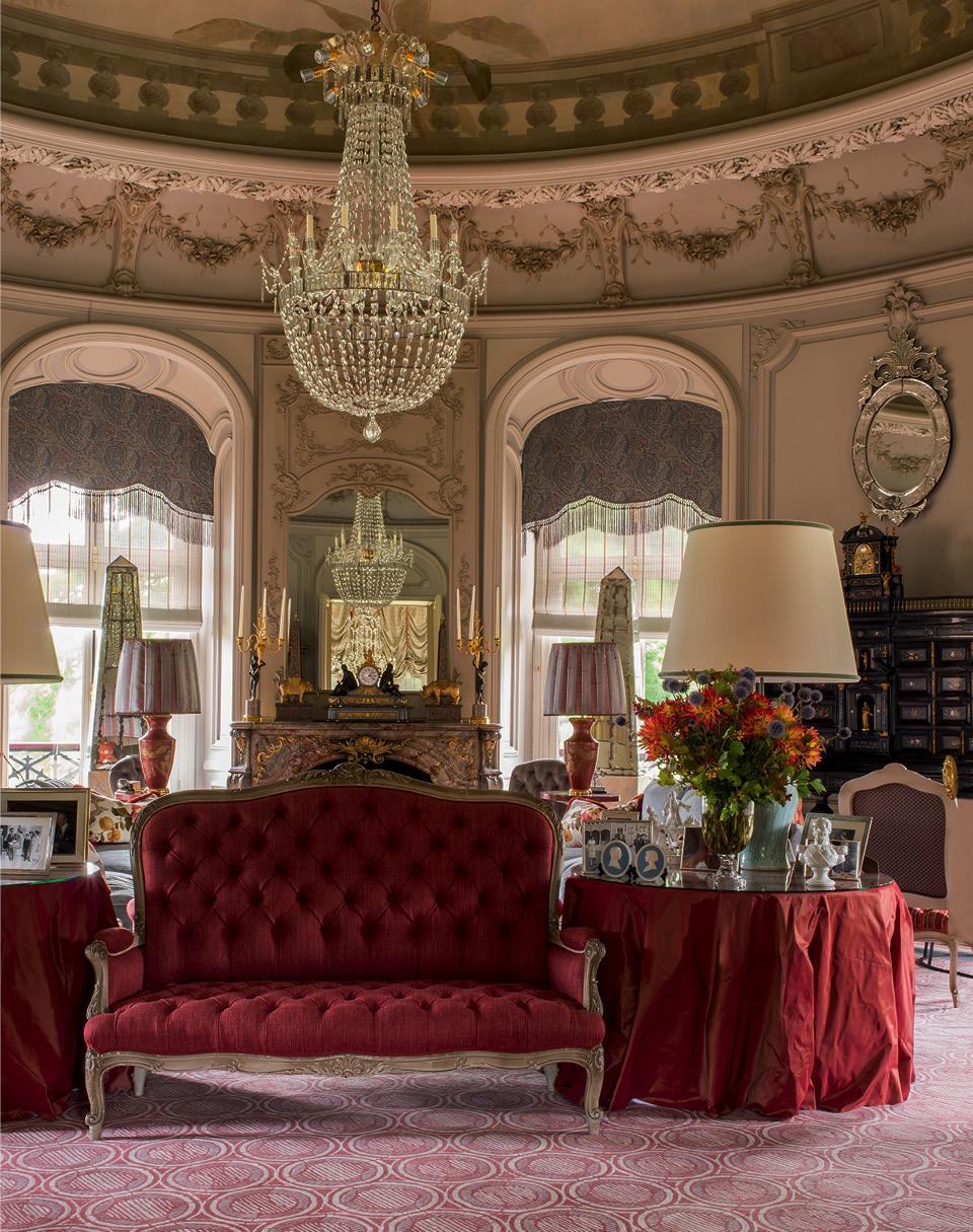 “Итальянская ротонда”, пристроенная к замку в XIX веке. Диаметр ковра по дизайну Ватле — 8,5 м. Флорентийский буфет на заднем плане антикварный, ткани — Jim Thimpson, Pierre Frey. Диванчик и зеркальные обелиски на заднем плане, у окон — по дизайну Ватле.